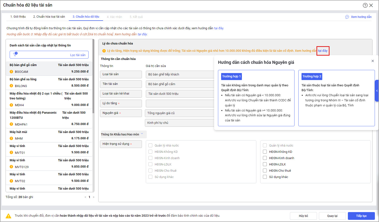 - Chọn Tại đây để xem hướng dẫn các chuẩn hóa Nguyên giá.