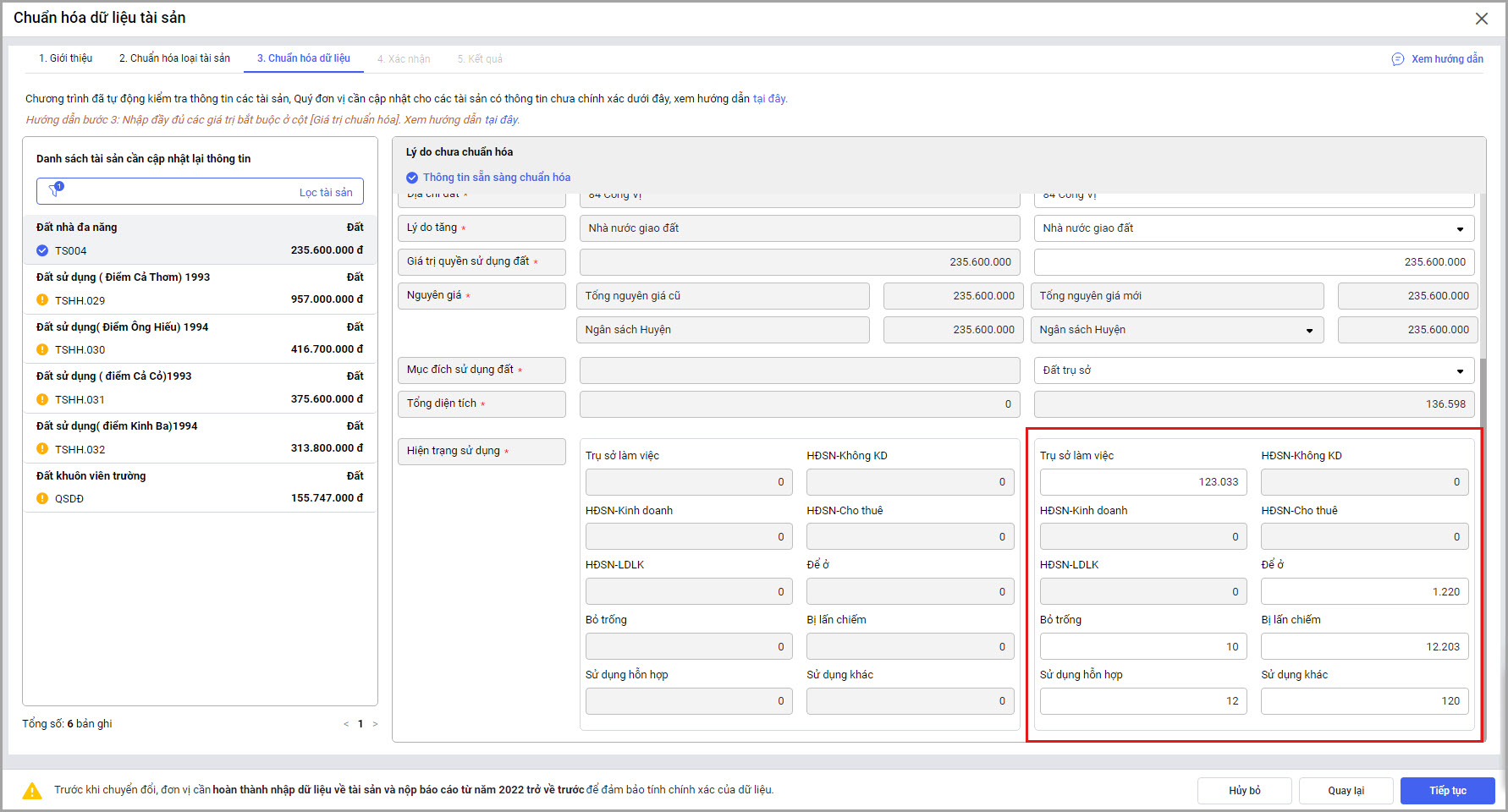 • Tại menu Tài sản\Chuẩn hóa dữ liệu tài sản công\Chuẩn hóa từng tài sản: tại Bước 3: Chuẩn hóa dữ liệu