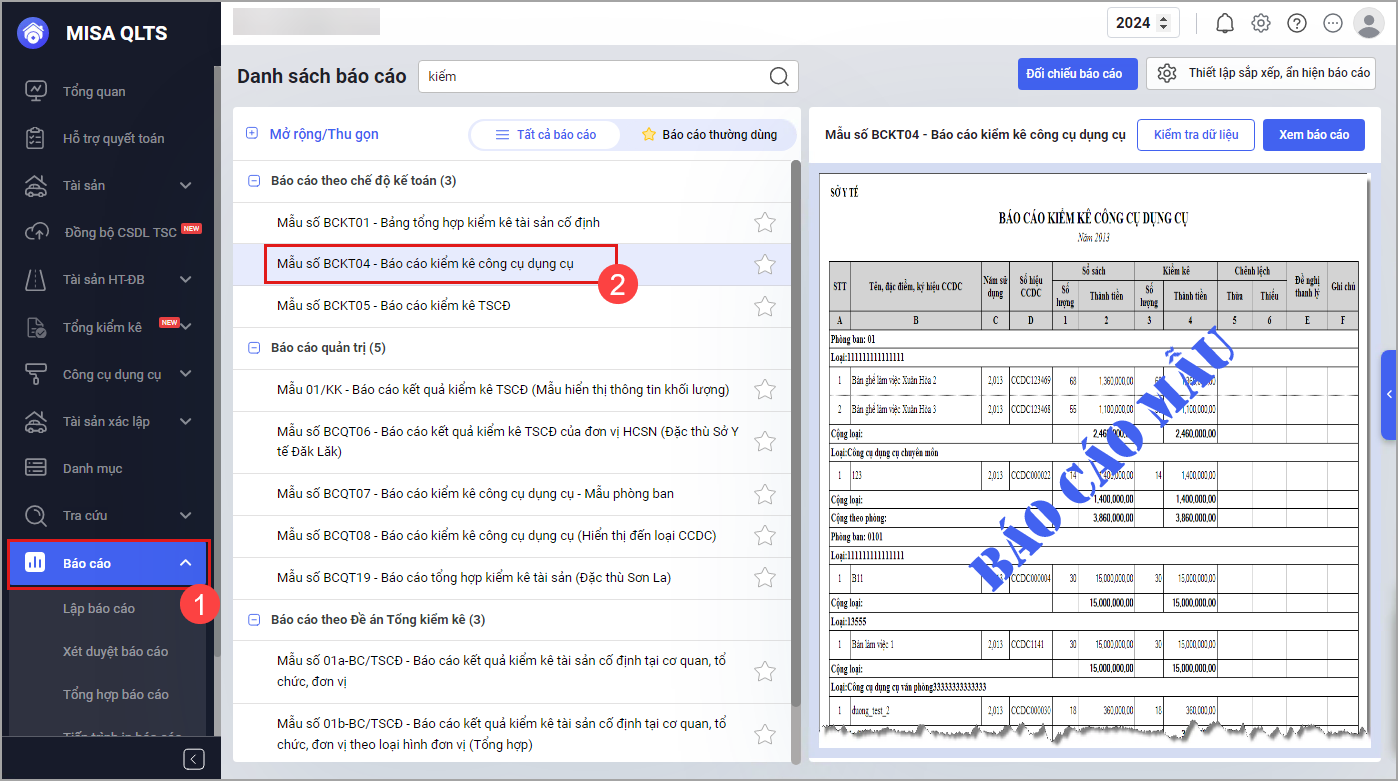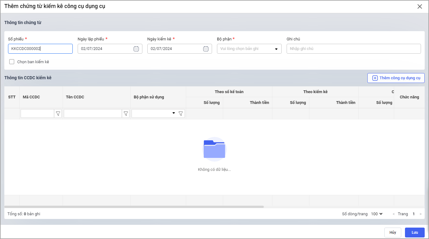 - Tại menu Báo cáo\Báo cáo kiểm kê Công cụ dụng cụ: