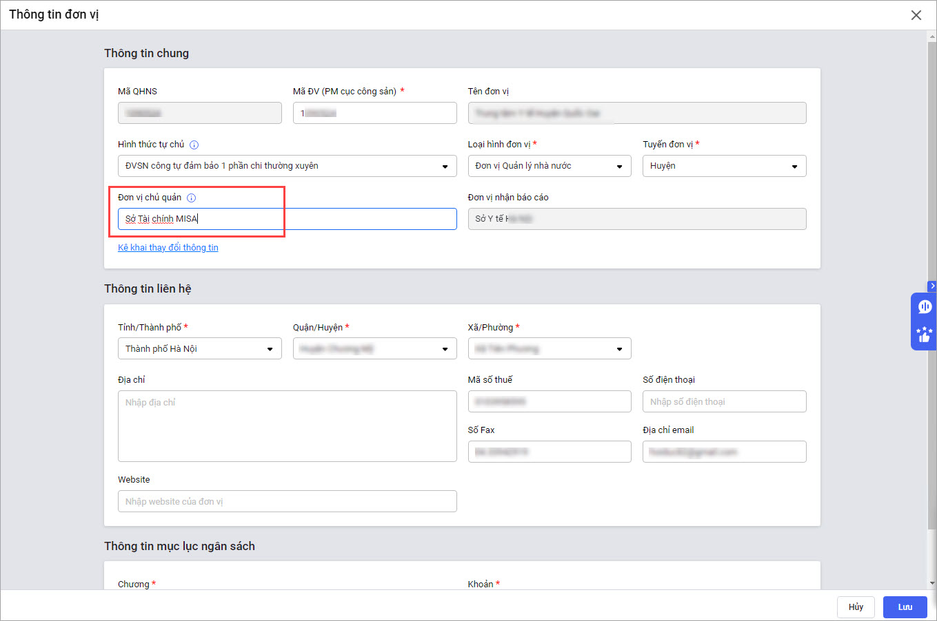 • Bổ sung trường thông tin Đơn vị chủ quản cho phép anh/chị nhập/sửa thông tin đơn vị chủ quản.