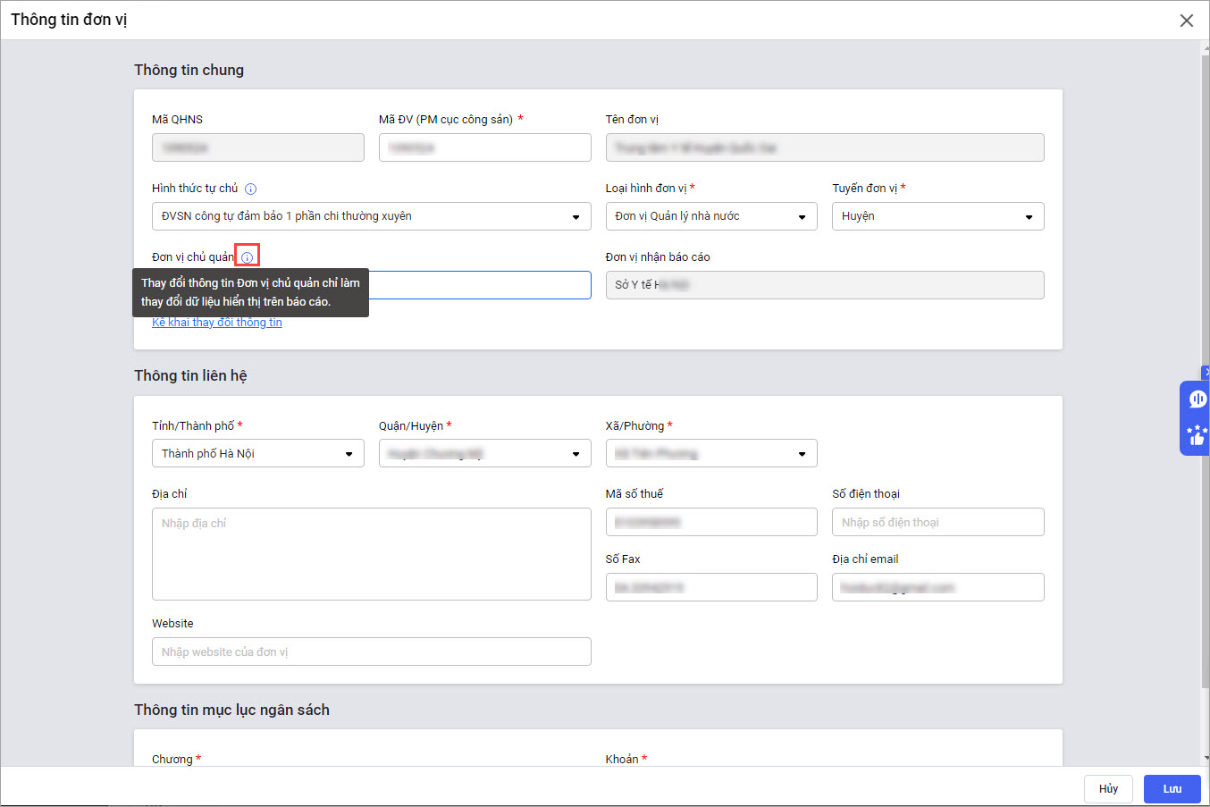 Lưu ý: Thay đổi thông tin Đơn vị chủ quản chỉ làm thay đổi dữ liệu hiển thị trên báo cáo, khi anh/chị đưa trỏ chuột vào biểu tượng chữ i phần mềm sẽ hiển thị lưu ý.