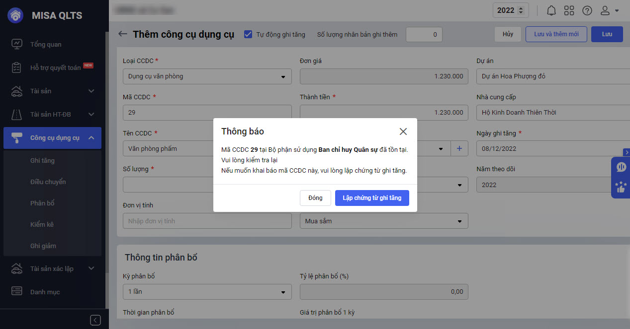 Bước 1: Tại Menu Công cụ dụng cụ\Khai báo CCDC: Mã CCDC và Phòng ban là riêng biệt nếu phát hiện trùng mã sau khi thêm CCDC thì phần mềm sẽ hiển thị cảnh báo. Anh/chị nhấn Đóng sau đó tiến hành sửa lại mã CCDC.