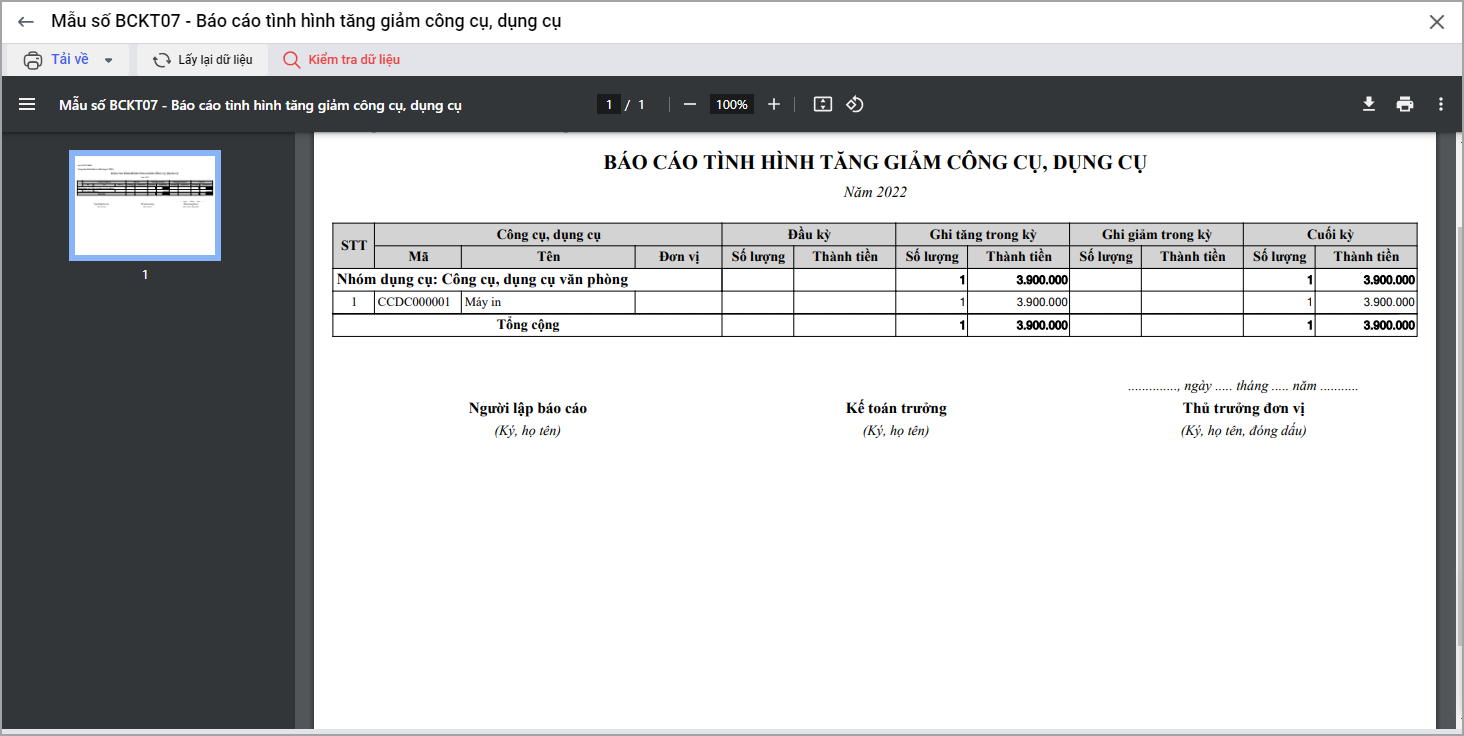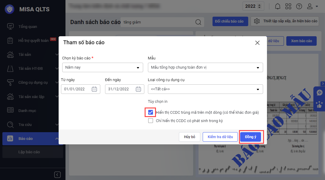 Bước 3: Tại Báo cáo: Báo cáo tình hình tăng, giảm CCDC: Bổ sung tùy chọn in.