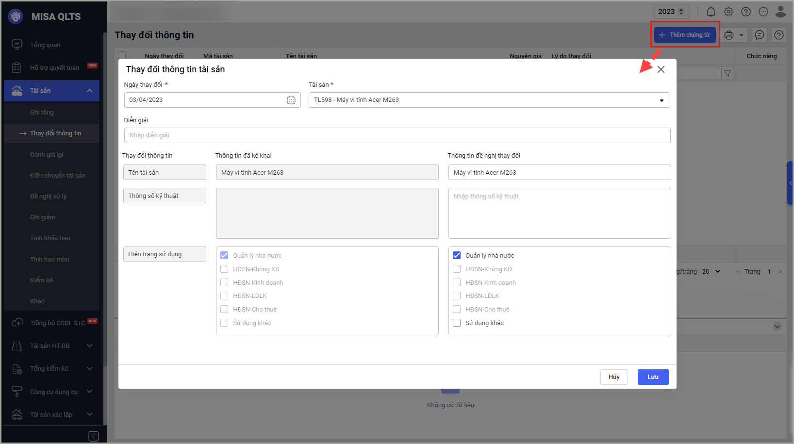 - Thông tin đã kê khai: Thông tin kê khai của tương ứng từng tài sản con trong lô trước khi lập chứng từ Thay đổi thông tin cho lô cha.