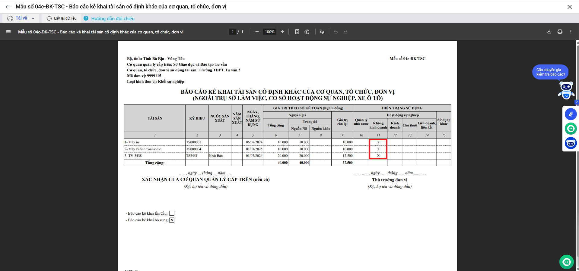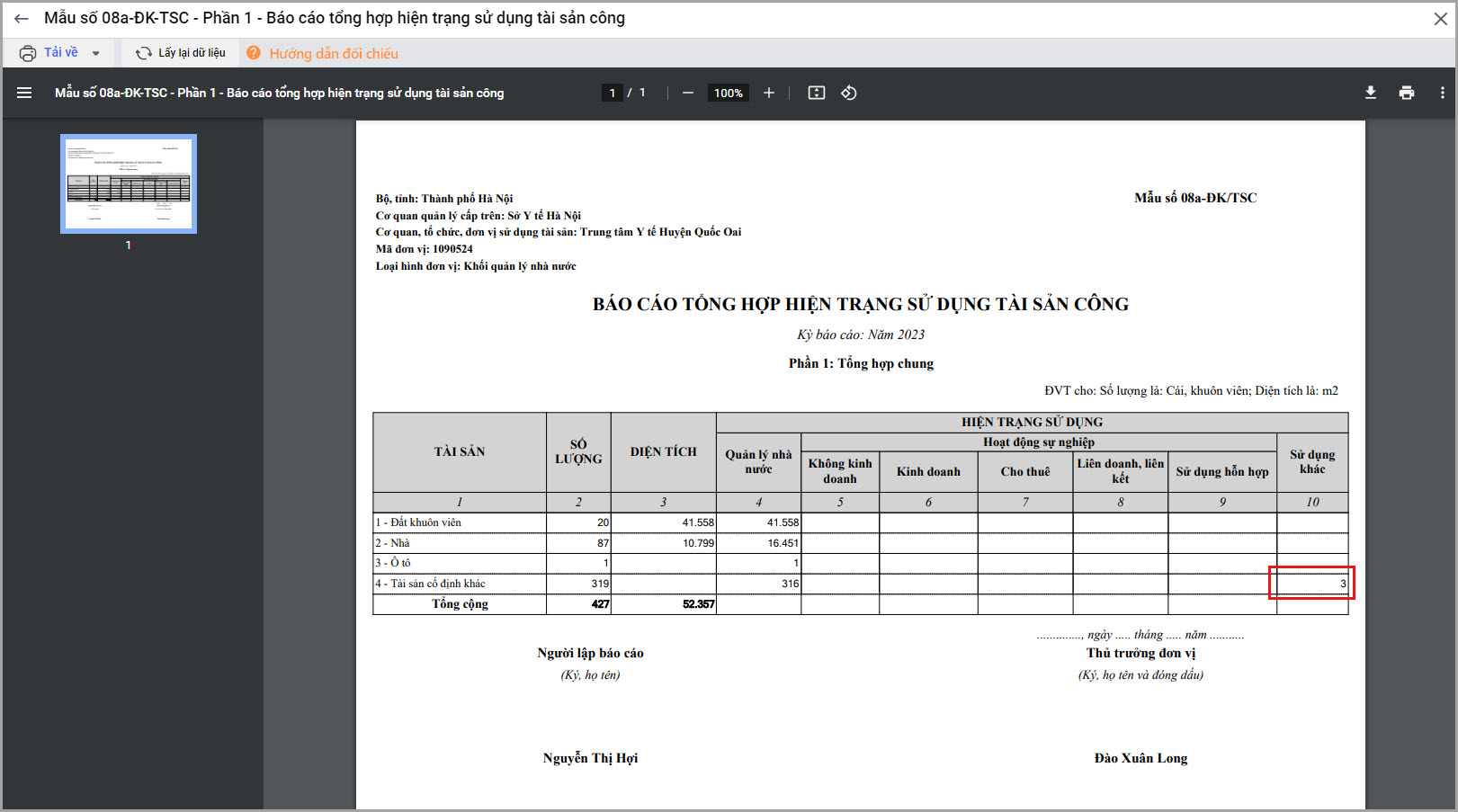 - Mẫu số 08a-ĐK-TSC Phần 1, 2, 3: Báo cáo tổng hợp hiện trạng sử dụng tài sản công.