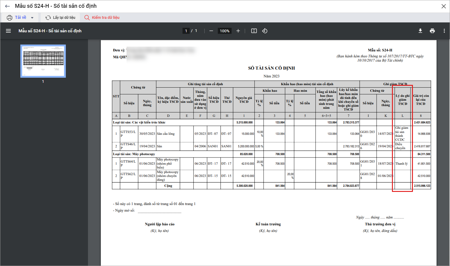 Cuối năm, đơn vị lập báo cáo S24-H: Sổ tài sản cố định, phần mềm sẽ lấy lên Hình thức xử lý của tài sản trên chứng từ để hiển thị trên cột ” Lý do ghi giảm của TSCĐ” để nắm rõ chi tiết hướng xử lý của tài sản.