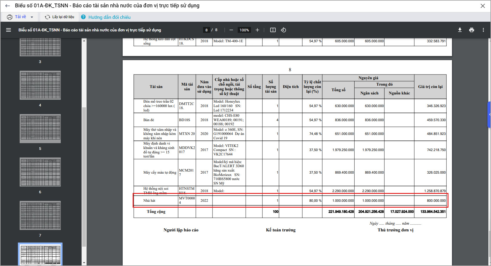 Cuối năm, anh/chị lập báo cáo Biểu số 01A-ĐK_TSNN – Báo cáo tài sản nhà nước của đơn vị trực tiếp sử dụng để nộp lên cấp trên. Thông tin diện tích lấy lên diện tích tương ứng của các tài sản là Đất, Nhà, Vật kiến trúc.