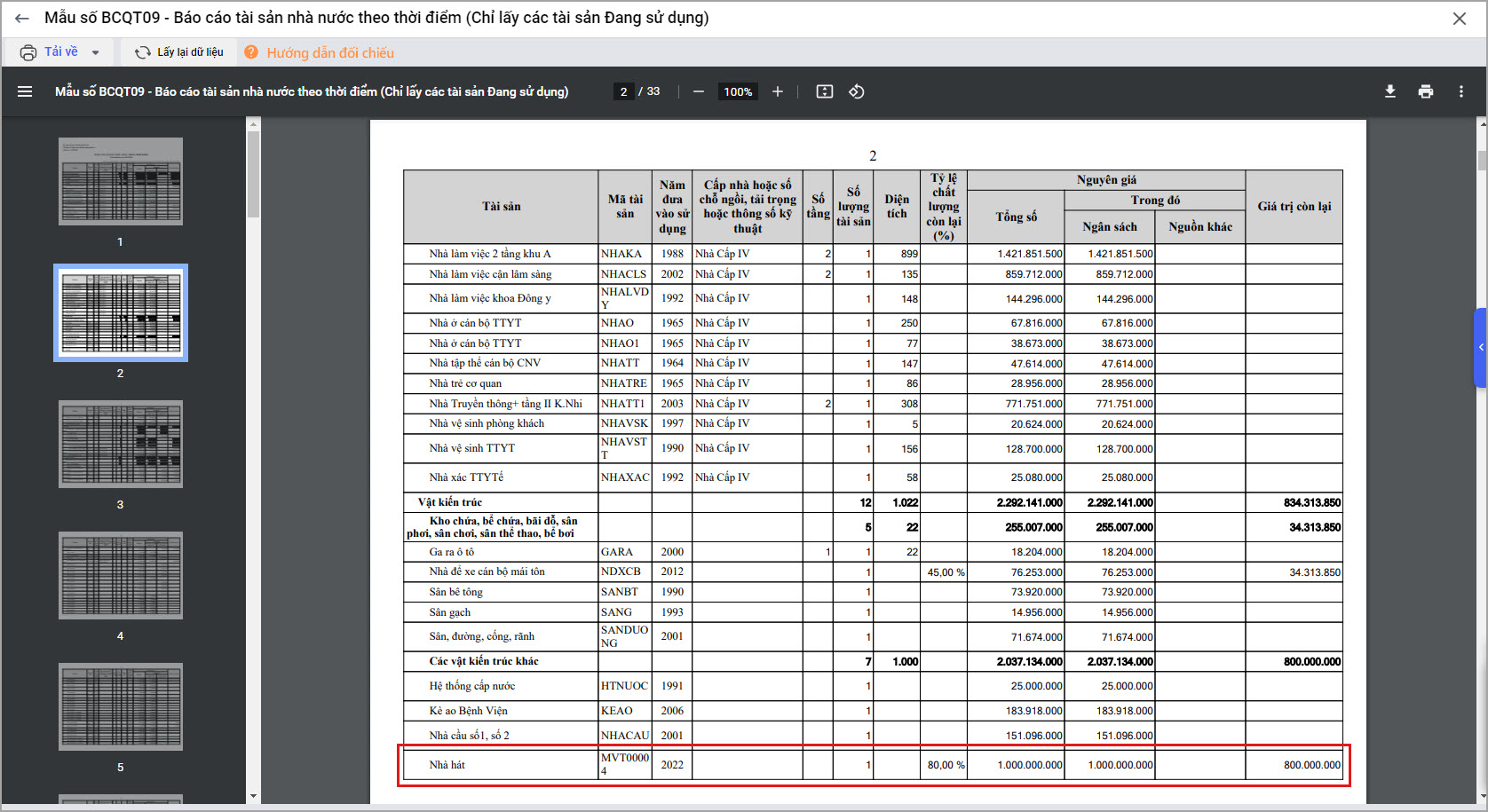 Ví dụ: Đơn vị có tài sản là vật kiến trúc tên là Nhà hát, trên báo cáo sẽ lấy lên diện tích của Nhà hát tại cột diện tích.