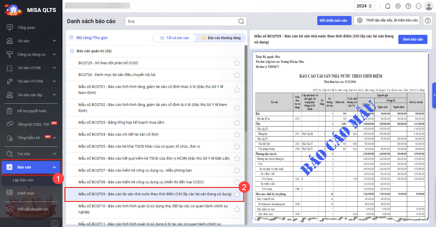 - Tại menu Báo cáo\Mẫu số BCQT09 – Báo cáo tài sản nhà nước theo thời điểm (chỉ lấy các tài sản Đang sử dụng):