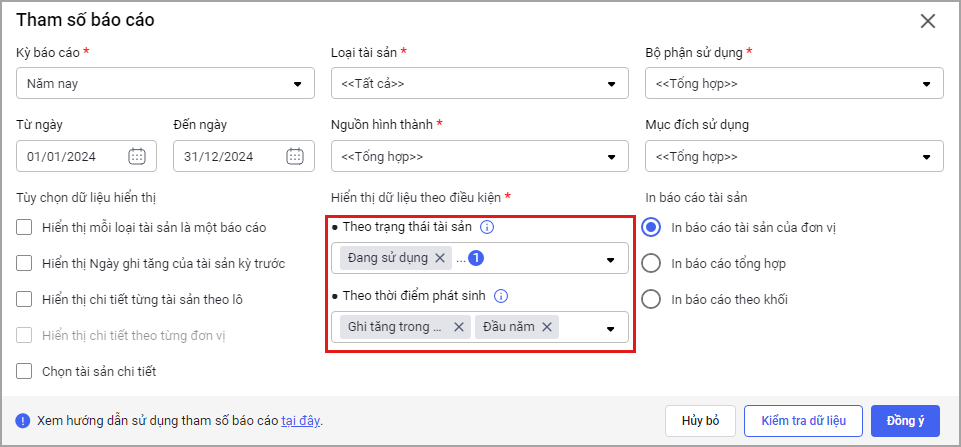 - Theo trạng thái tài sản tích chọn tài sản có trạng thái là Đang sử dụng và Đã ghi giảm trong kỳ