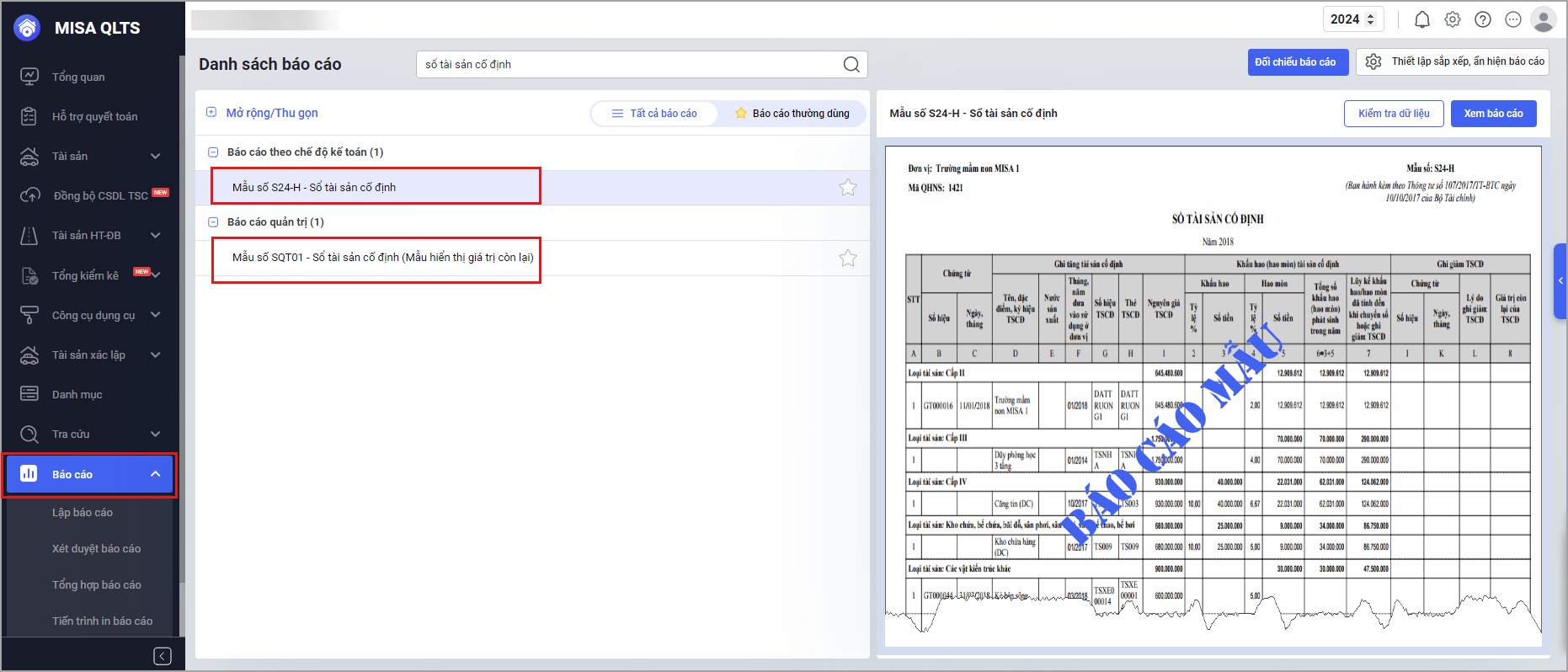 Tại menu Báo cáo khi in báo cáo S24 – H: Sổ tài sản cố định và SQT01 – Sổ TSCĐ: