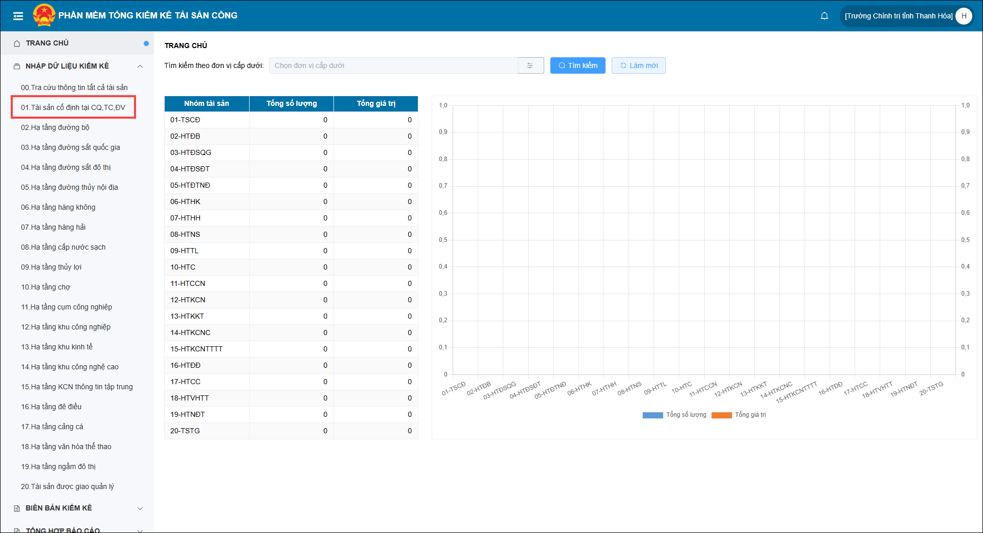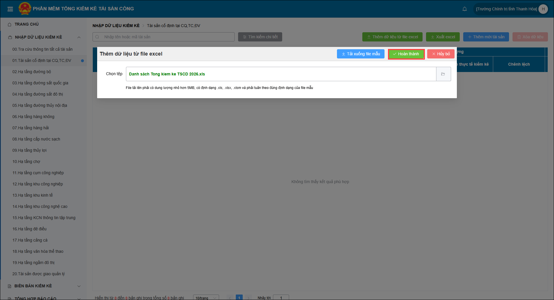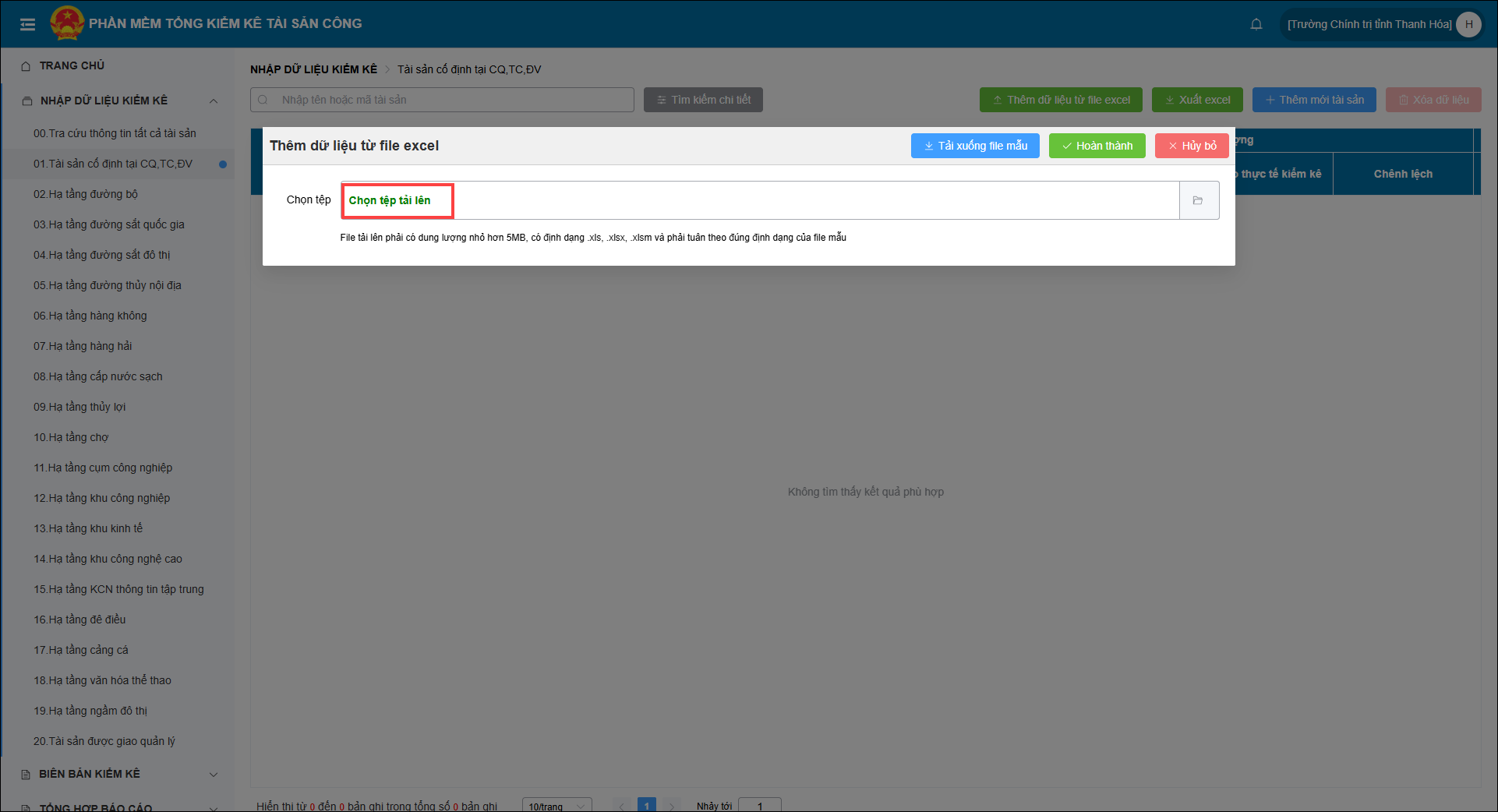• Tại mục Nhập khẩu dữ liệu kiểm kê lựa chọn 1 trong các hạng mục như: Tài sản cố định; Hạ tầng đê điều; Hạ tầng chợ..v..v..