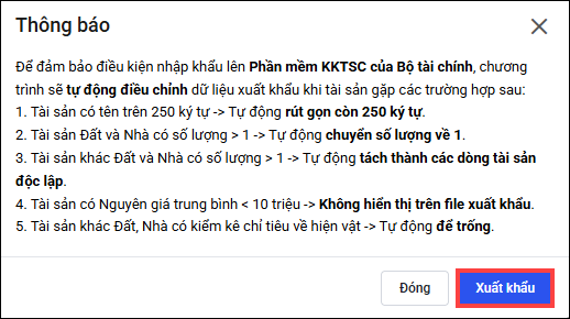 • Chương trình sẽ tự động điều chỉnh dữ liệu xuất khẩu để đảm bảo điều kiện nhập khẩu lên phần mềm KKTSC của bộ Tài chính. Anh/chị nhấn Xuất khẩu