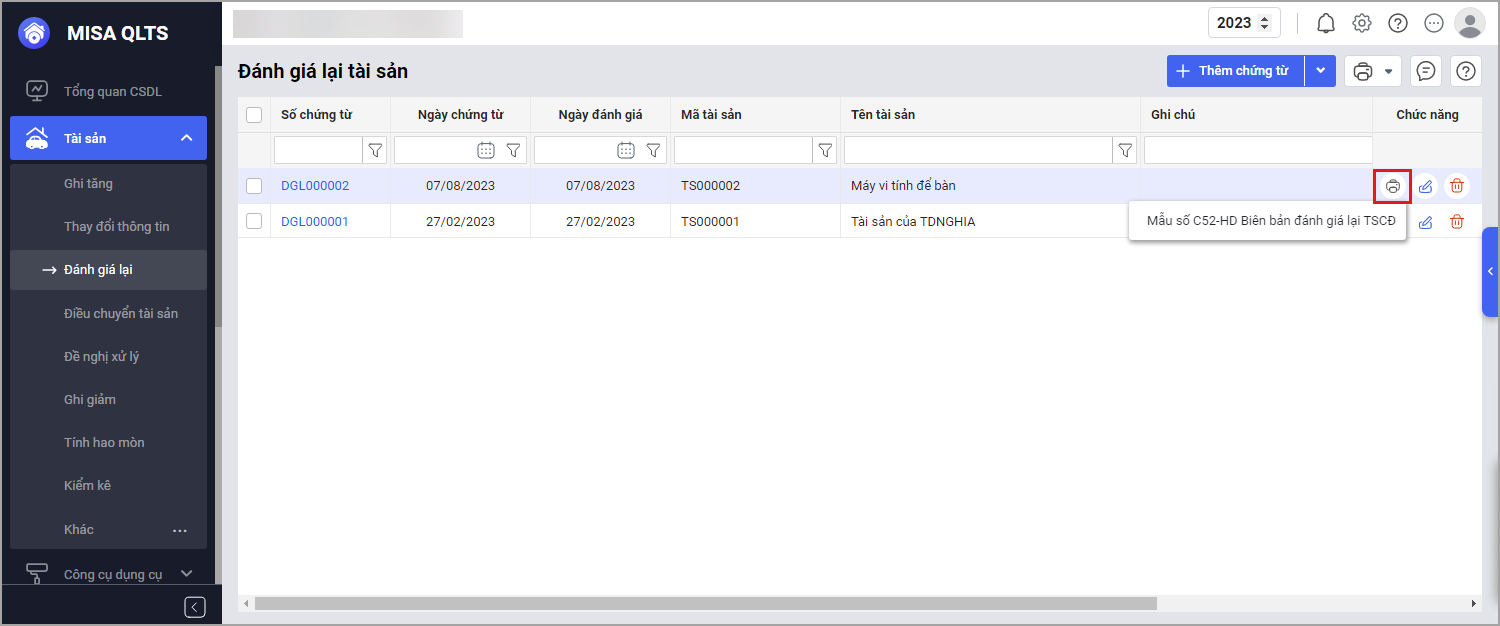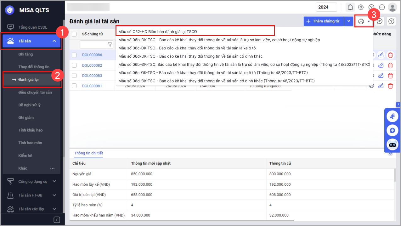 Tại menu Tài sản\Đánh giá lại: Ghi nhận kết quả chi tiết đánh giá lại theo từng tài sản. Trong 1 đợt đánh giá, cán bộ QLTS phải lập nhiều chính từ đánh giá lại cho từng tài sản và lập biên bản theo mẫu số C52 thủ công