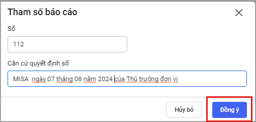- Cán bộ QLTS chọn tham số báo cáo, chọn Đồng ý để xem báo cáo