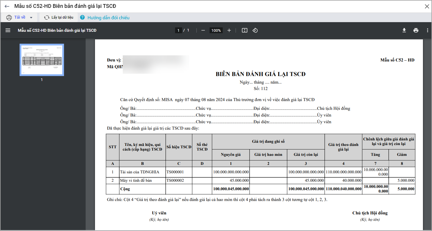 Bài viết này giúp anh/chị biết cách in mẫu C52 – Biên bản đánh giá lại TSCĐ để nộp lên cấp trên