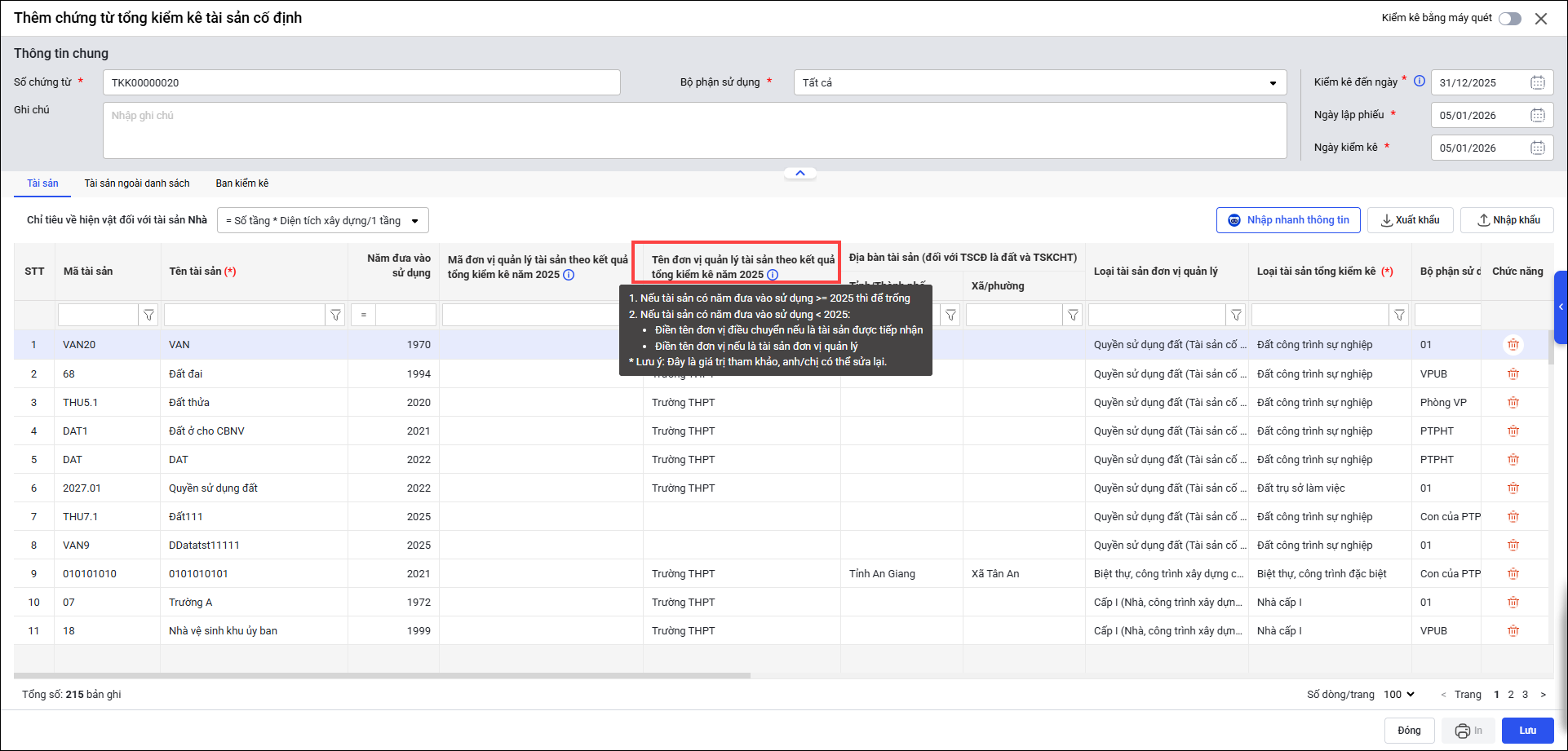 Nếu tài sản có năm đưa vào sử dụng >= 2025 thì để trống.