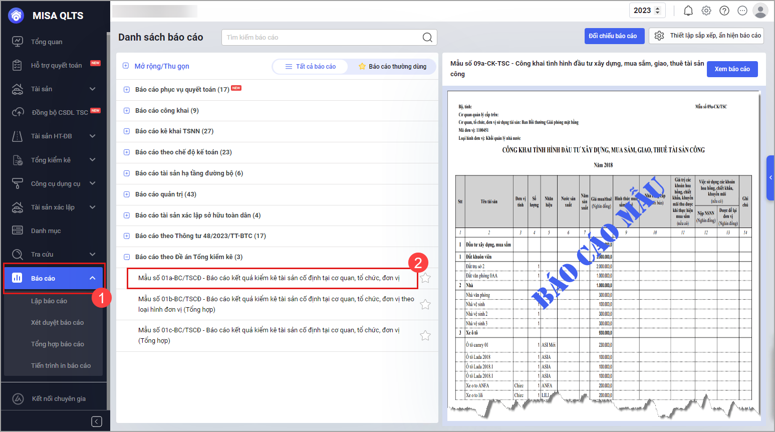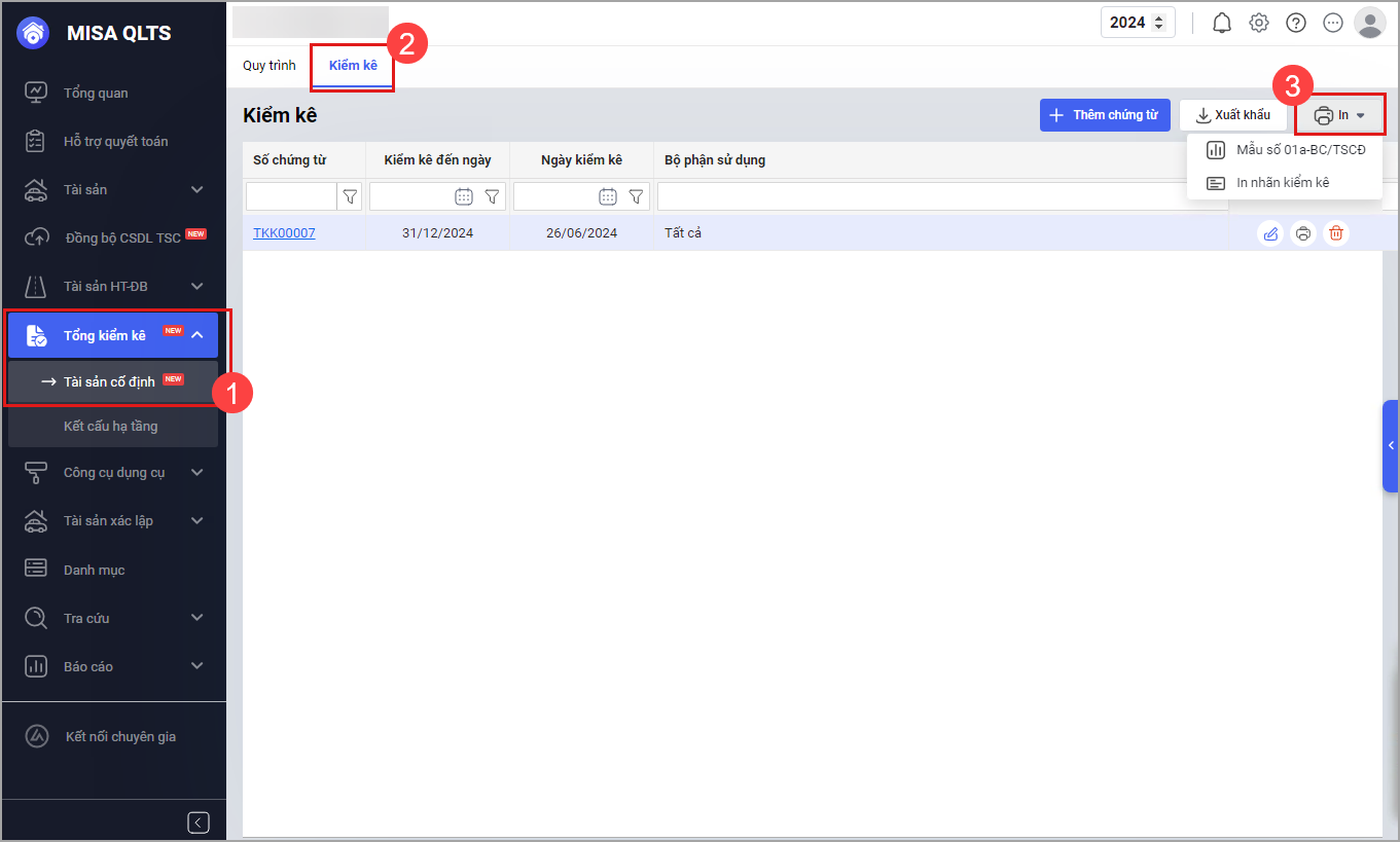 2. Cán bộ QLTS muốn in các Báo cáo kiểm kê tài sản cố định theo Mẫu số 01a-BC/TSCĐ quy định tại Quyết định 1138/2024/QĐ-BTC