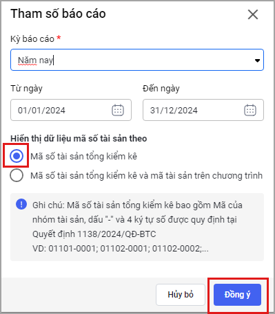 Bài viết này giúp anh/chị có thể in các Báo cáo kiểm kê tài sản cố định theo Mẫu số 01a-BC/TSCĐ quy định tại Quyết định 1138/2024/QĐ-BTC