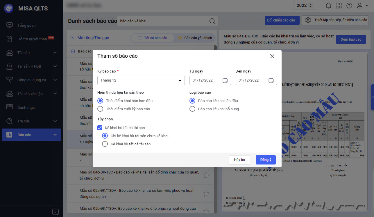 • Tại Báo cáo\Mẫu số 04a-ĐK-TSC-Báo cáo kê khai trụ sở làm việc, cơ sở hoạt động sự nghiệp của cơ quan, tổ chức, đơn vị, bổ sung: Tại màn hình Tham số báo cáo.