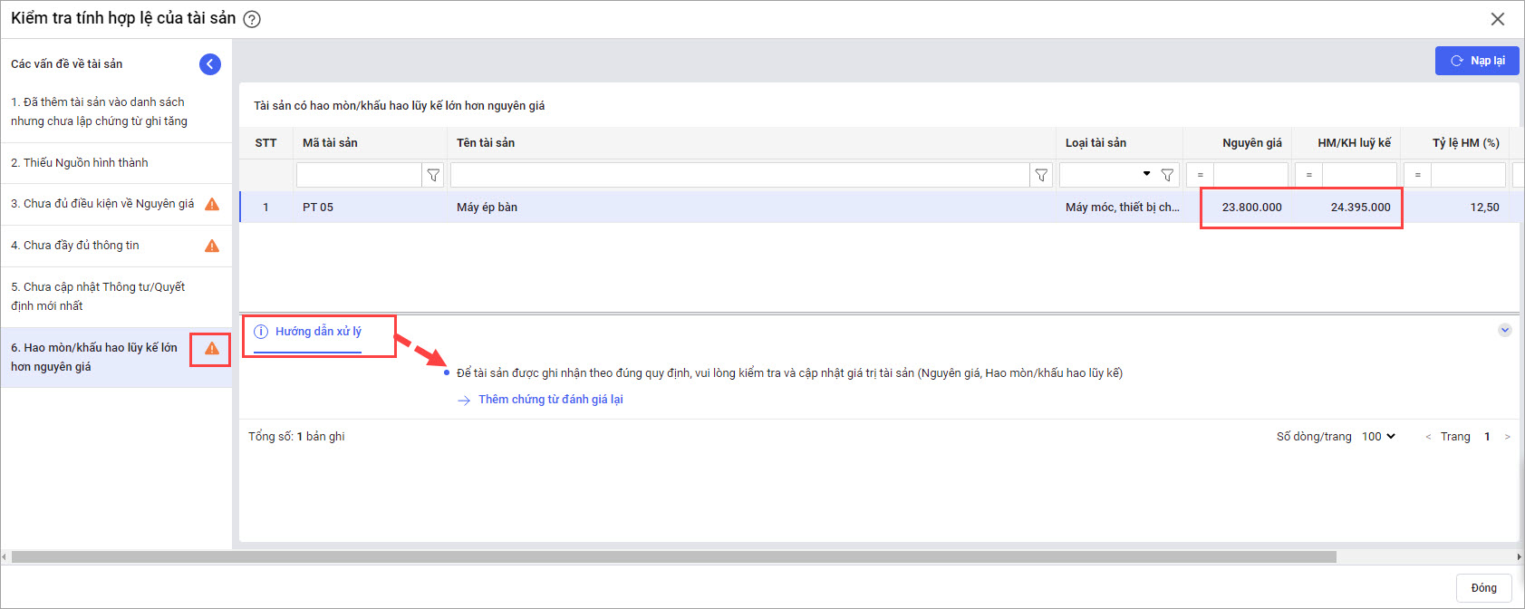 - Tại Menu Hỗ trợ quyết toán tại bước Kiểm tra tính hợp lệ của tài sản: Bổ sung vấn đề Hao mòn/khấu hao lũy kế lớn hơn nguyên giá.