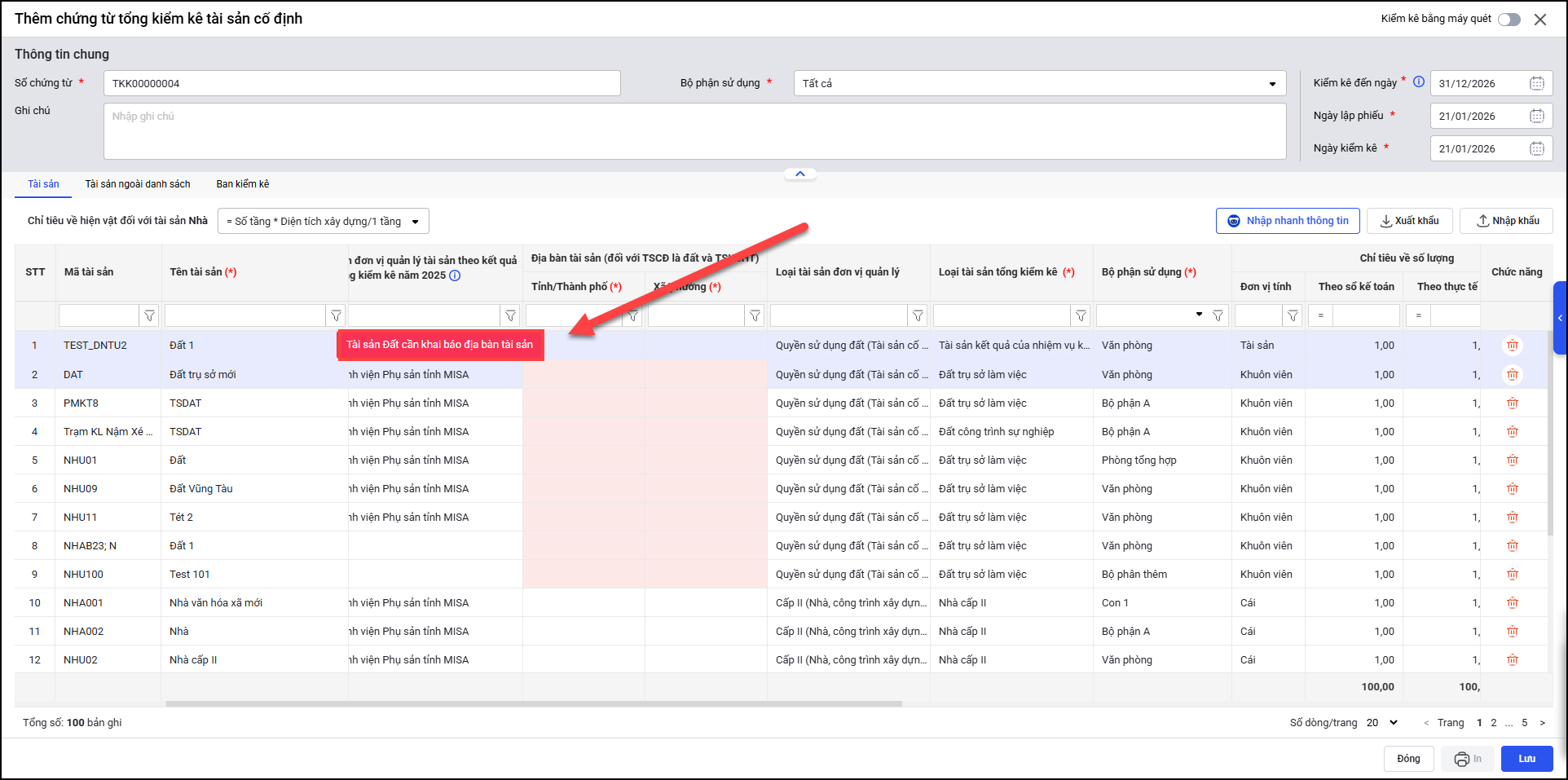 3. Ngoài ra, phần mềm cũng bổ sung tính năng kiểm tra tính hợp lệ với tài sản là Đất trong trường hợp cán bộ QLTS chưa khai báo thông tin địa bàn, nhấn Lưu chương trình sẽ hiển thị cảnh báo “Tài sản đất cần khai báo địa bàn tài sản”