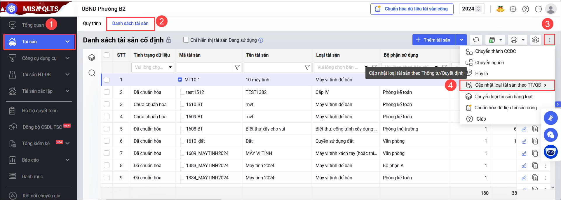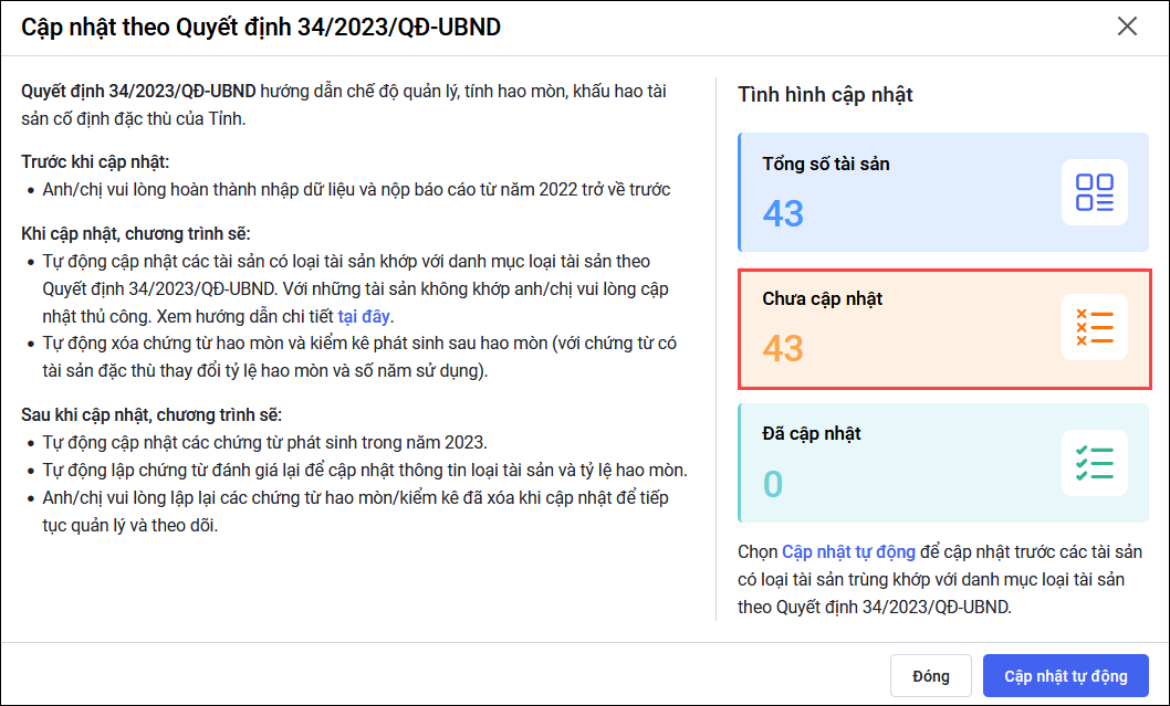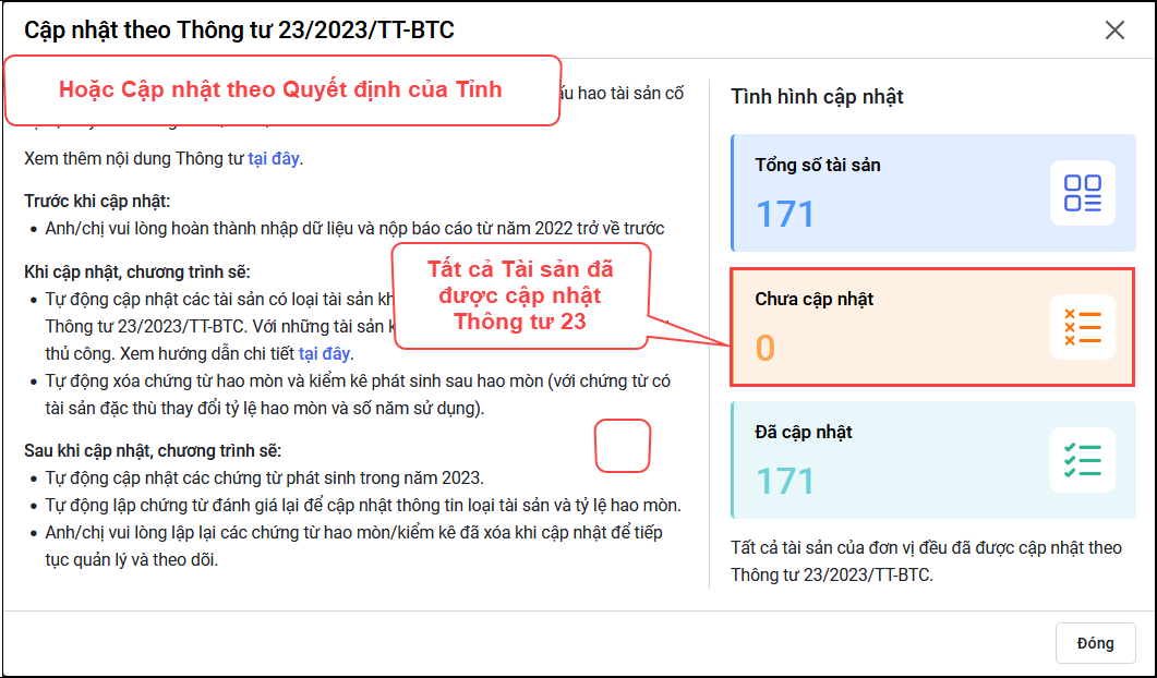- Các bước cập nhật loại tài sản theo Thông tư 23/2023/TT-BTC hoặc Quyết định của Tỉnh.