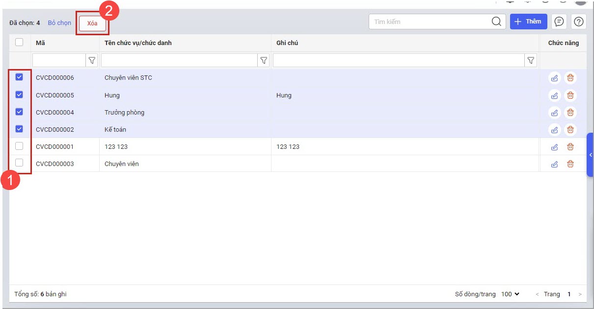 Trường hợp 2: Xóa nhiều Chức vụ/Chức danh: