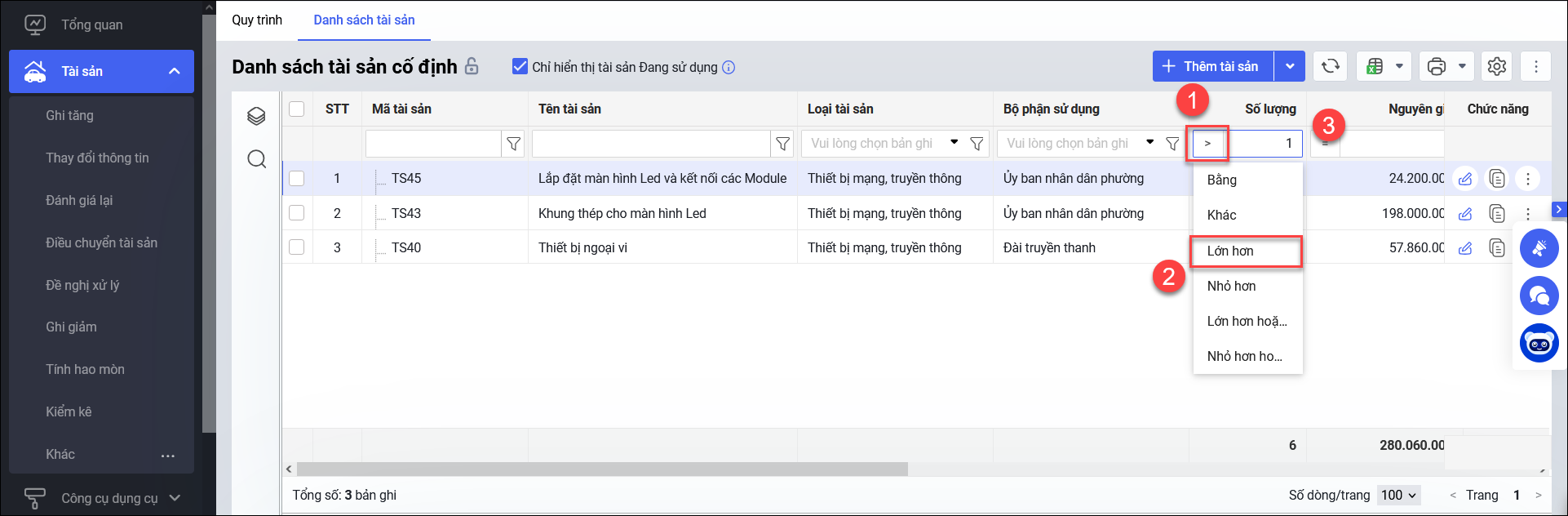 • Trên danh sách tài sản, thực hiện tìm đến cột Số lượng, chọn tiêu thức lọc “Lớn hơn” và đánh số 1.