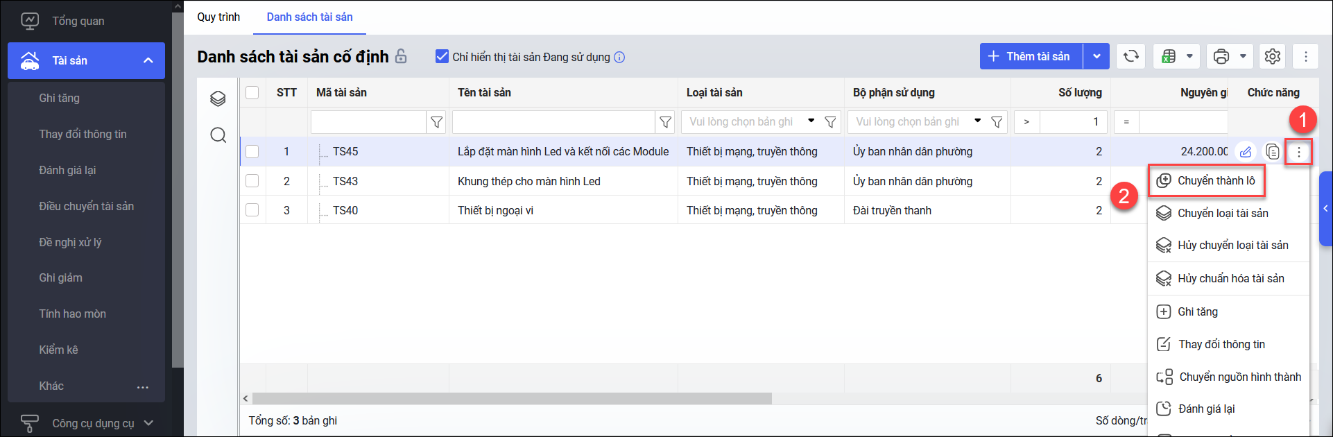 • Tại từng tài sản đã được lọc ở bước 1, nhấn nút ba chấm cuối dòng, chọn Chuyển thành lô.