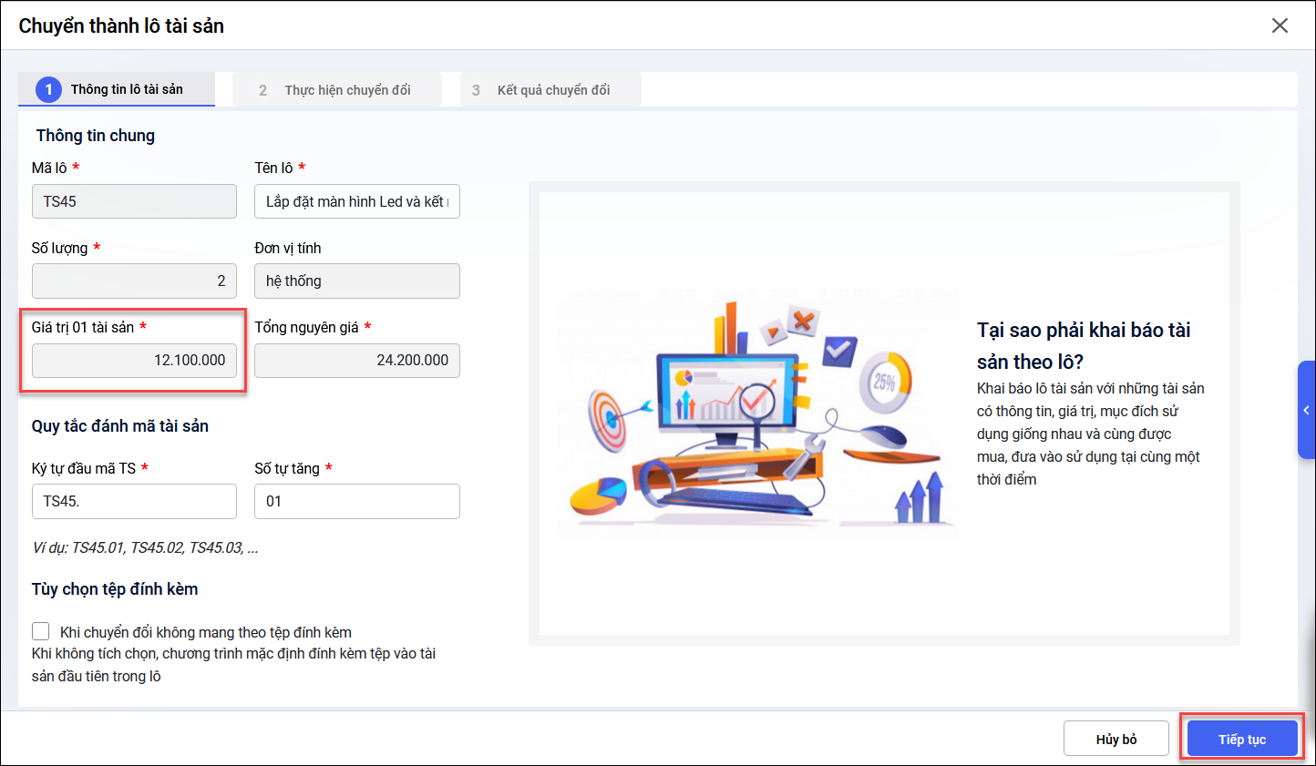 • Tại tab 1 – Thông tin lô tài sản: anh/chị kiểm tra thông tin chung, sửa lại quy tắc đánh mã tài sản (nếu có) và nhấn Tiếp tục.