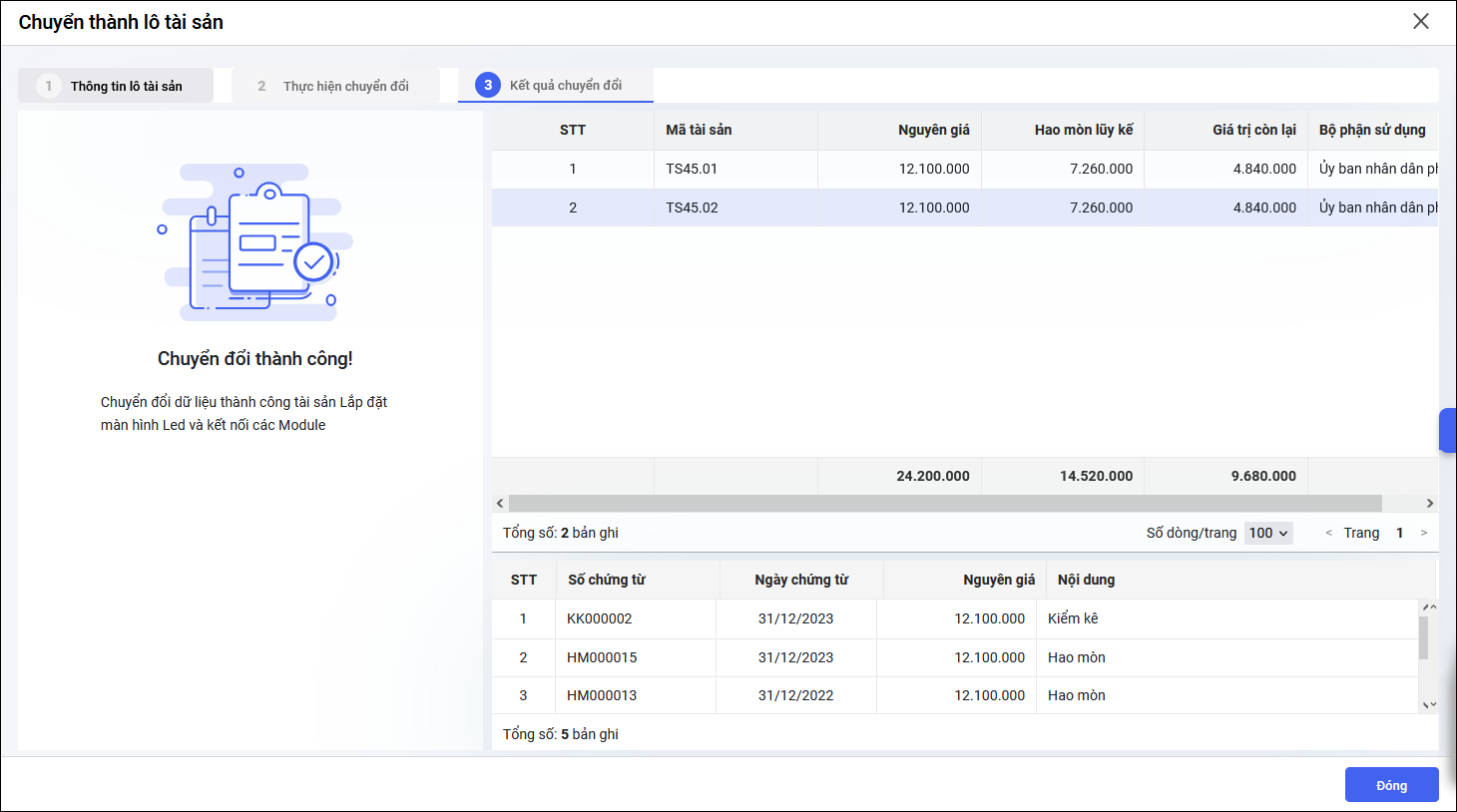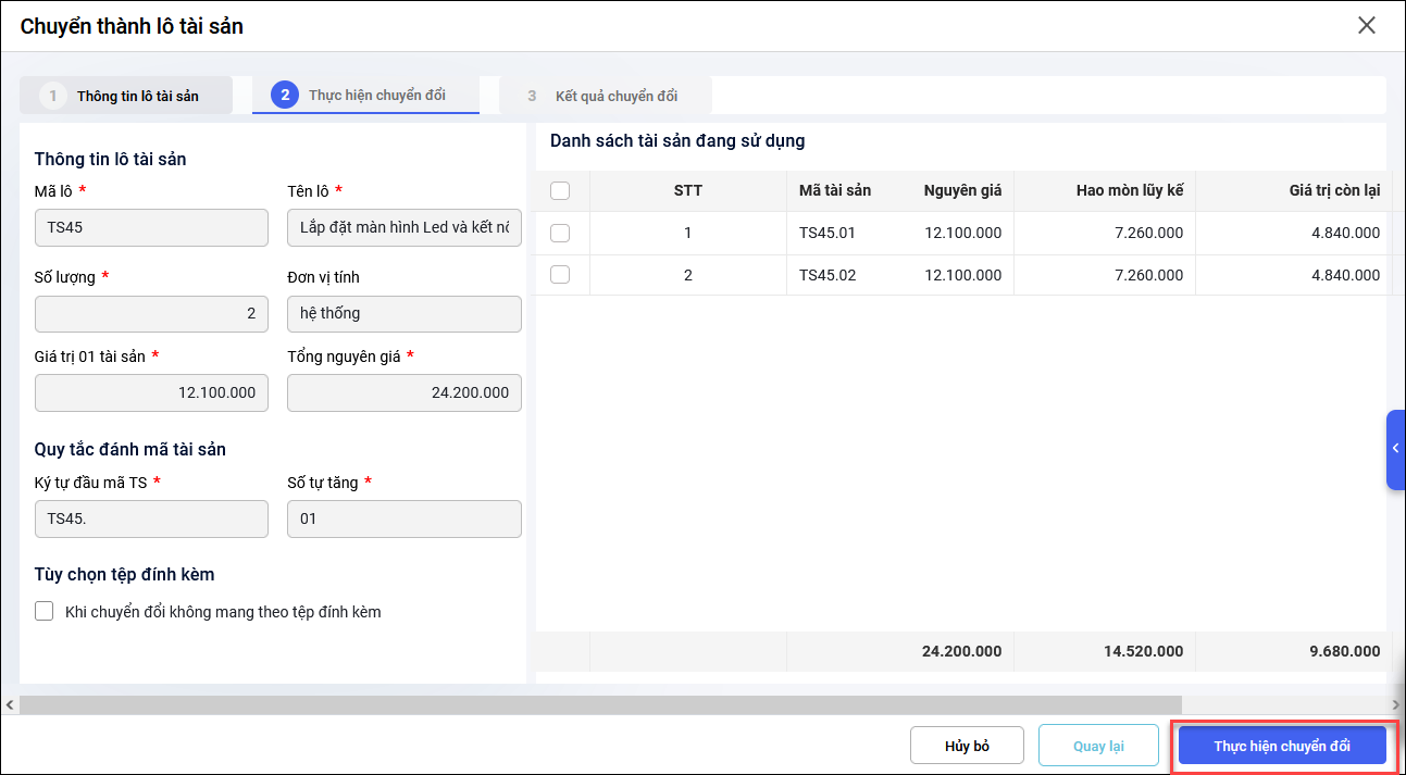 • Tại tab 2 – Thực hiện chuyển đổi: anh/chị kiểm tra thông tin lô tài sản và nhấn Thực hiện chuyển đổi.