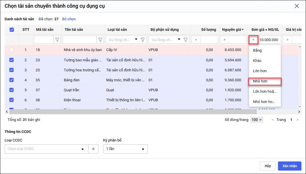 Lưu ý: Để lọc nhanh các tài sản có Nguyên giá dưới 10 triệu, tại cột Đơn giá = NG/SL, chọn tiêu thức Nhỏ hơn và nhập 10.000.000 ấn enter để ra danh sách tài sản có nguyên giá dưới 10 triệu.