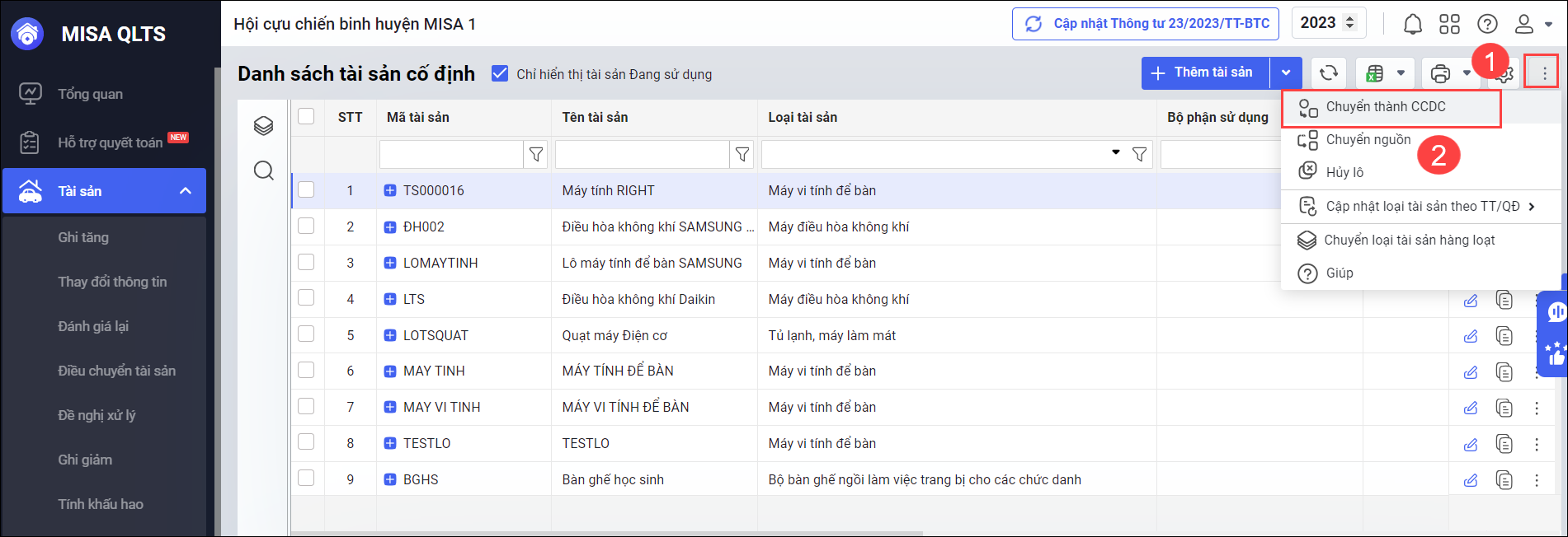 - Vào menu Tài sản\Danh sách tài sản cố định, nhấn vào ⁝, chọn Chuyển thành CCDC.