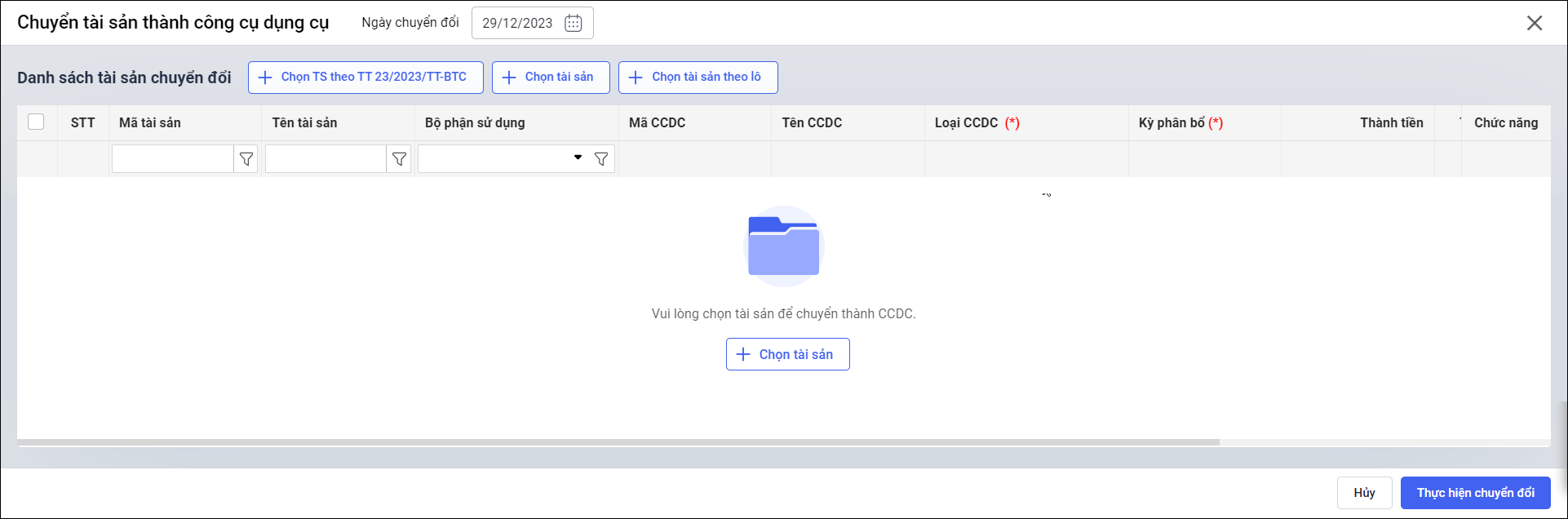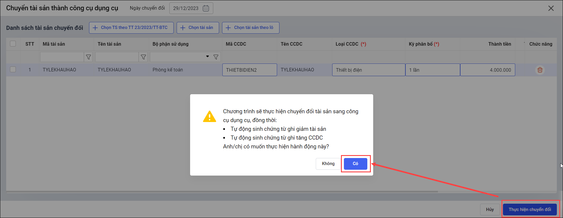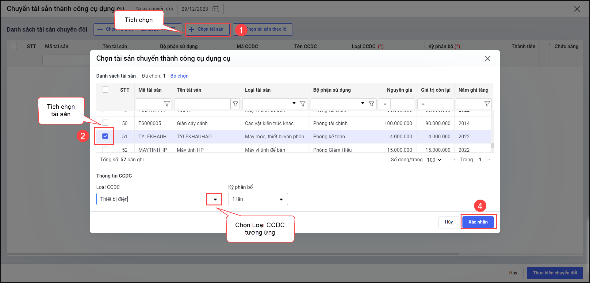 - Sau khi chọn đủ những tài sản cần chuyển đổi, chọn Loại CCDC và Kỳ phân bổ. Nhấn Xác nhận.
