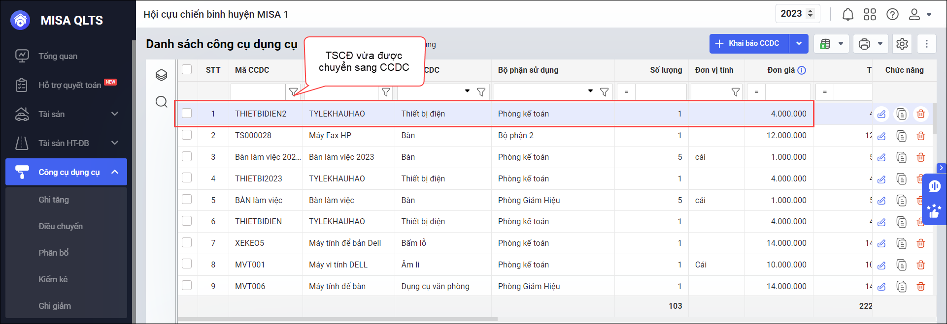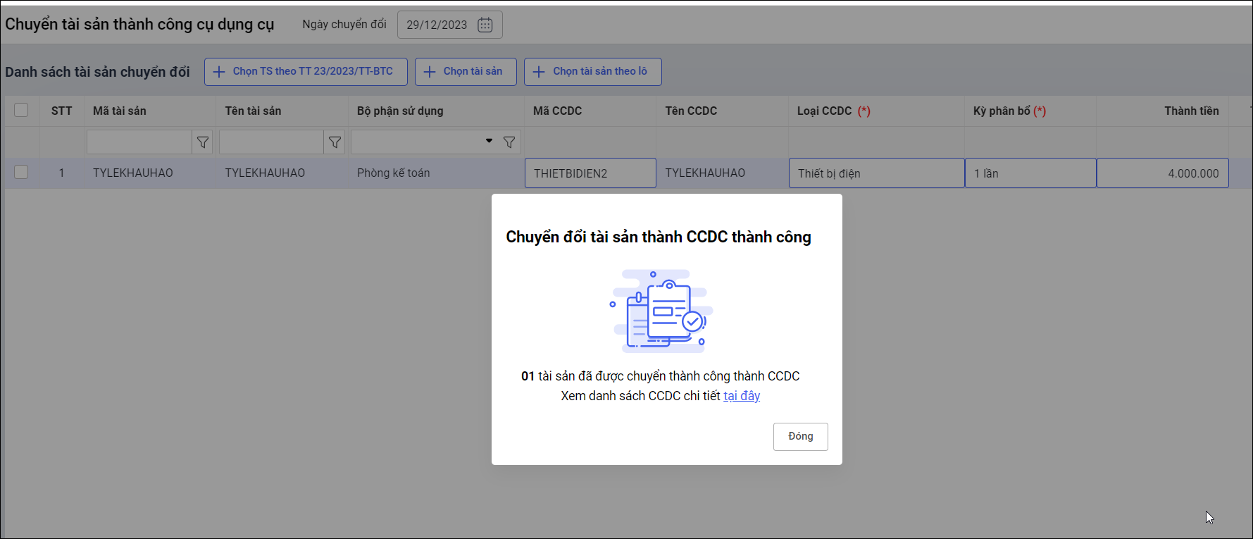 - Tại Công cụ dụng\Danh sách Công cụ dụng cụ hiển thị những tài sản vừa được chuyển đổi thành công.