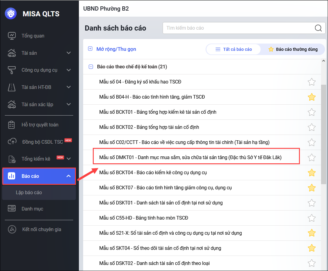 1. Vào menu Báo cáo\Báo cáo theo chế độ kế toán.Tại đây phần mềm đã bổ sung Danh mục mua sắm, sửa chữa tài sản tăng (Đặc thù Sở Y tế Đăk Lăk)