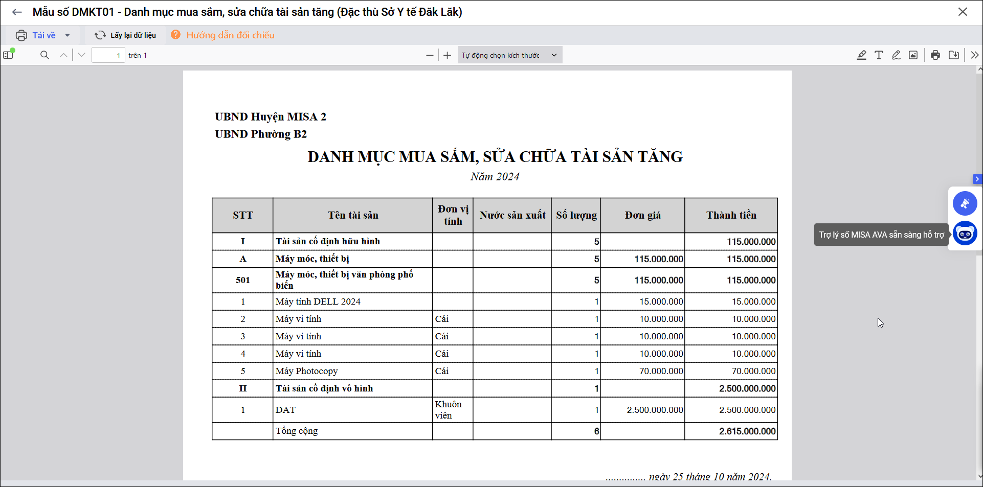 Giúp đơn vị in được Danh mục mua sắm, sửa chữa tài sản tăng (Đặc thù Sở Y tế Đăk Lăk)