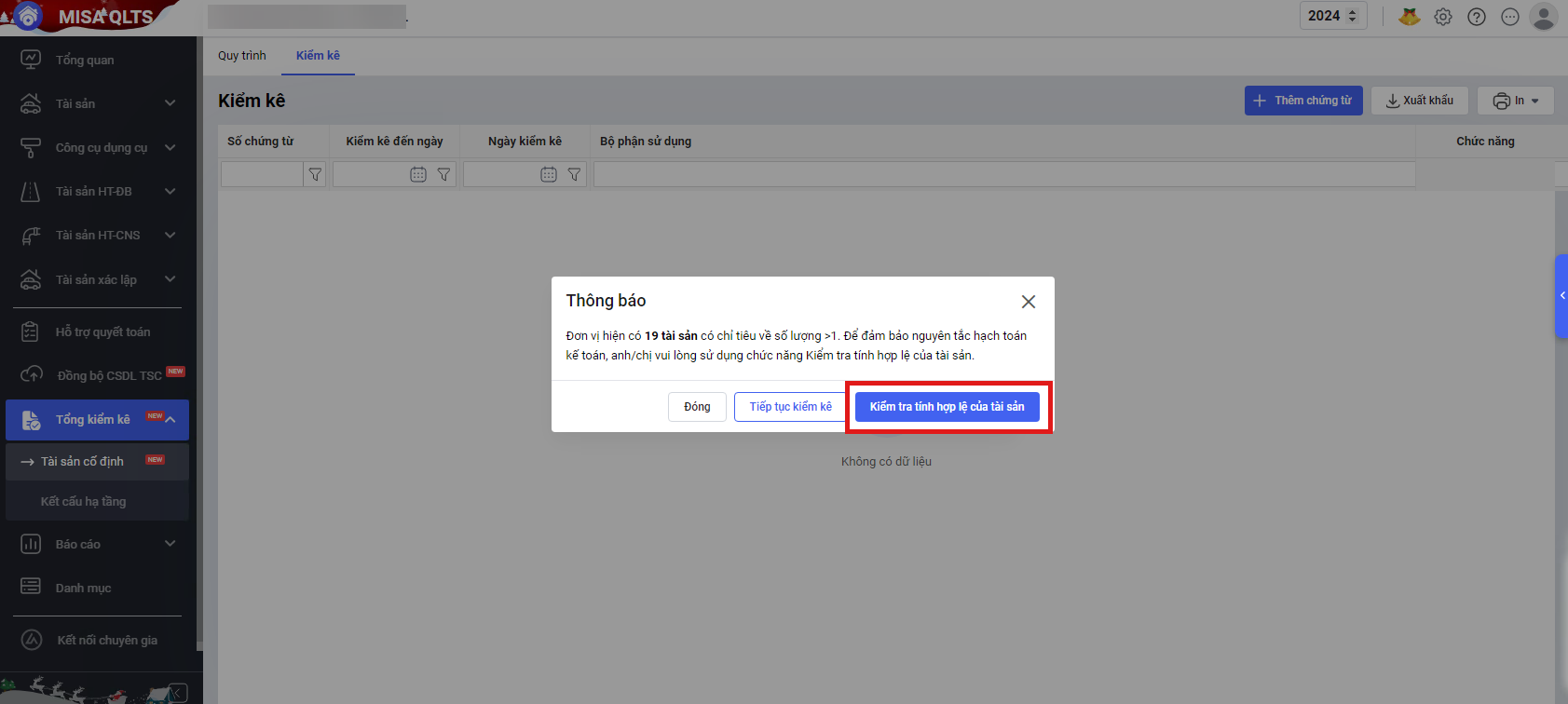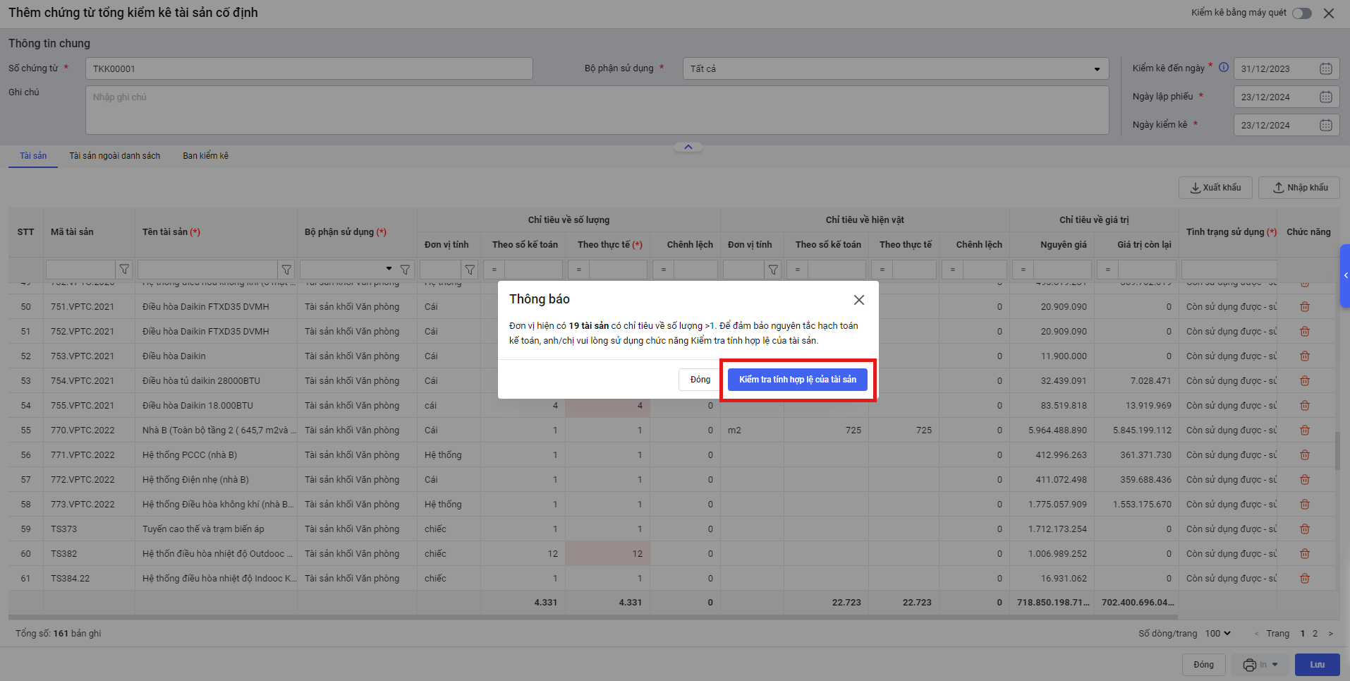 - Khi lập chứng từ kiểm kê, nếu có tài sản chưa hợp lệ khi lưu chứng từ, phần mềm sẽ hiển thị cảnh báo, chọn Kiểm tra tính hợp lệ của tài sản để kiểm tra và bổ sung
