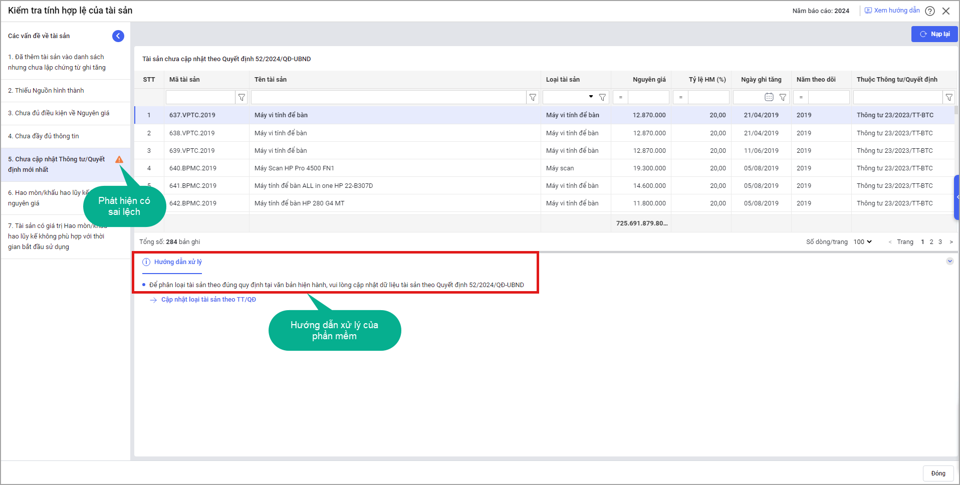 - Chọn Kiểm tra tính hợp lệ của tài sản để kiểm tra và bổ sung/chỉnh sửa thông tin tài sản nếu có sai sót. Nếu phát hiện có sai sót, phần mềm sẽ hiển thị cảnh báo màu cam kèm hướng dẫn xử lý