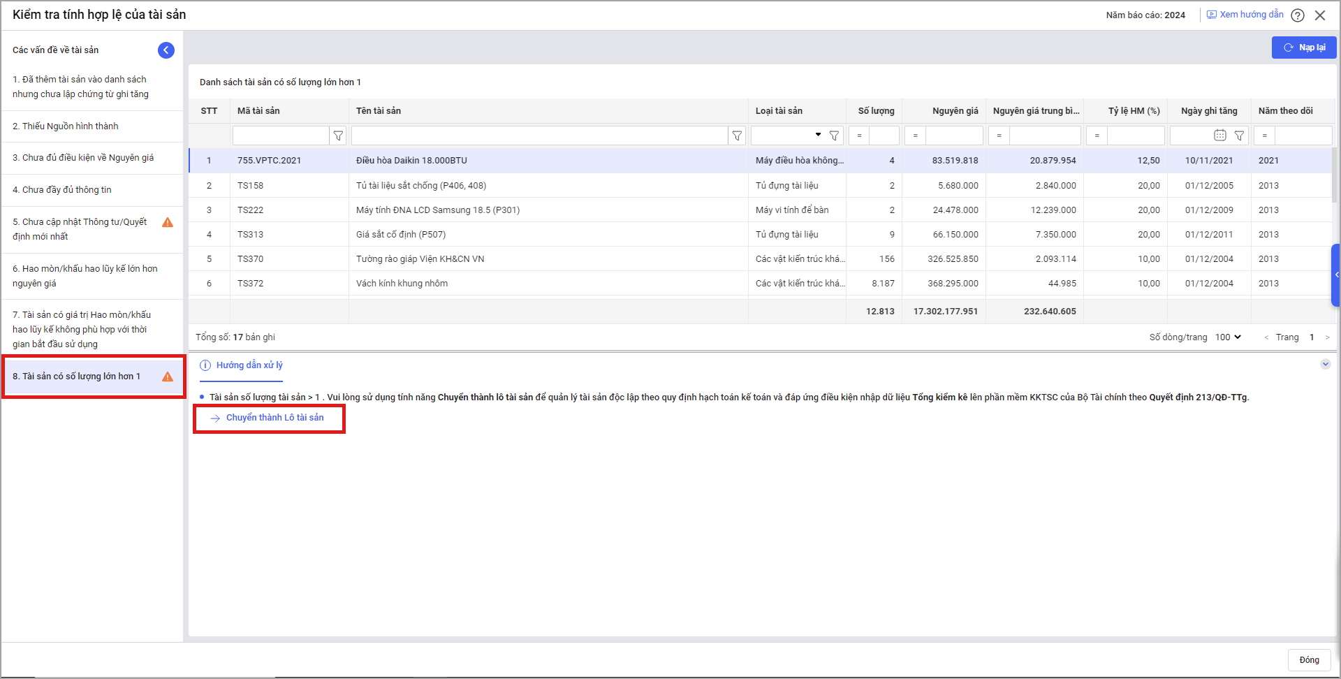 - Chọn vấn đề thứ 8: Tài sản có số lượng lớn hơn 1, anh/chị kiểm tra và chọn Chuyển thành Lô tài sản để xử lý vấn đề này, anh/chị xem hướng dẫn chi tiết tại đây