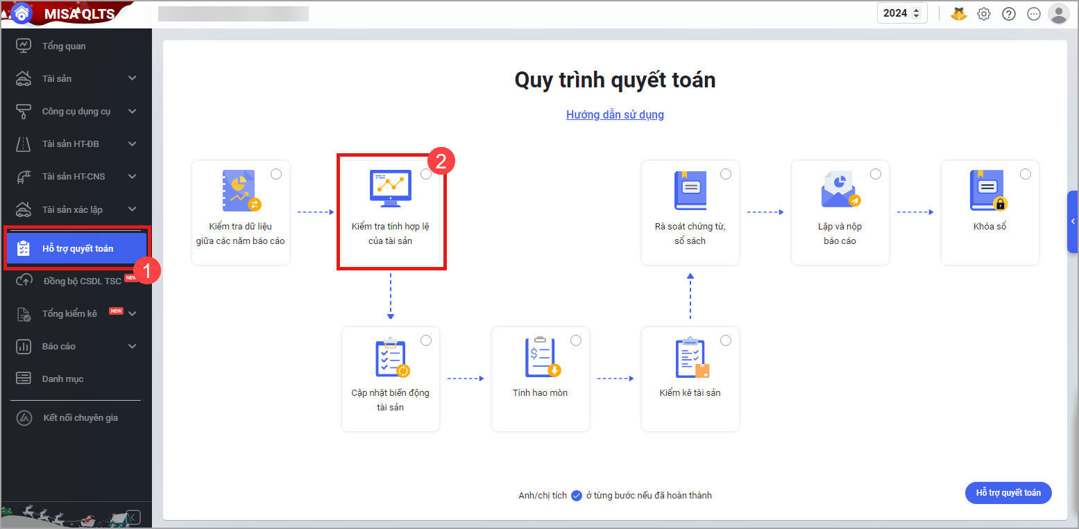 Tại menu Hỗ trợ quyết toán\Kiểm tra tính hợp lệ của tài sản