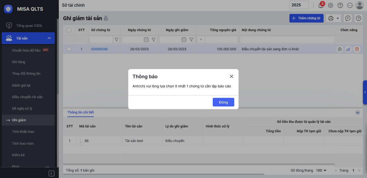 • Tại Danh sách chứng từ ghi giảm, khi phần mềm sẽ hiển thị thông báo nhắc nhở: “Anh/chị vui lòng lựa chọn ít nhất 1 chứng từ cần lập báo cáo”, anh/chị cần tích chọn vào ô vuông ở đầu từng dòng chứng từ trước khi thực hiện in Mẫu số C51–HD: Biên bản thanh lý TSCĐ.