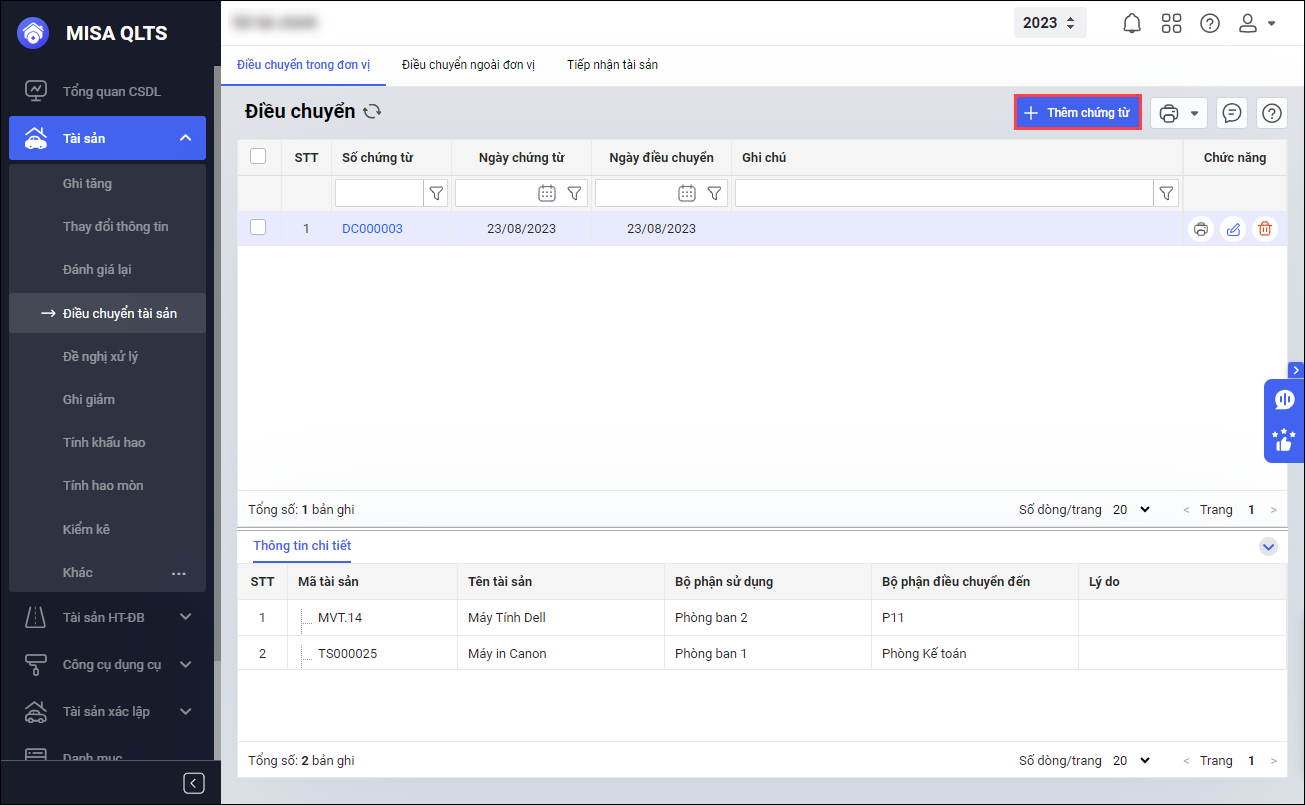 - Bước 1: Vào Tài sản/Điều chuyển tài sản, chọn tab Điều chuyển trong đơn vị, nhấn Thêm chứng từ