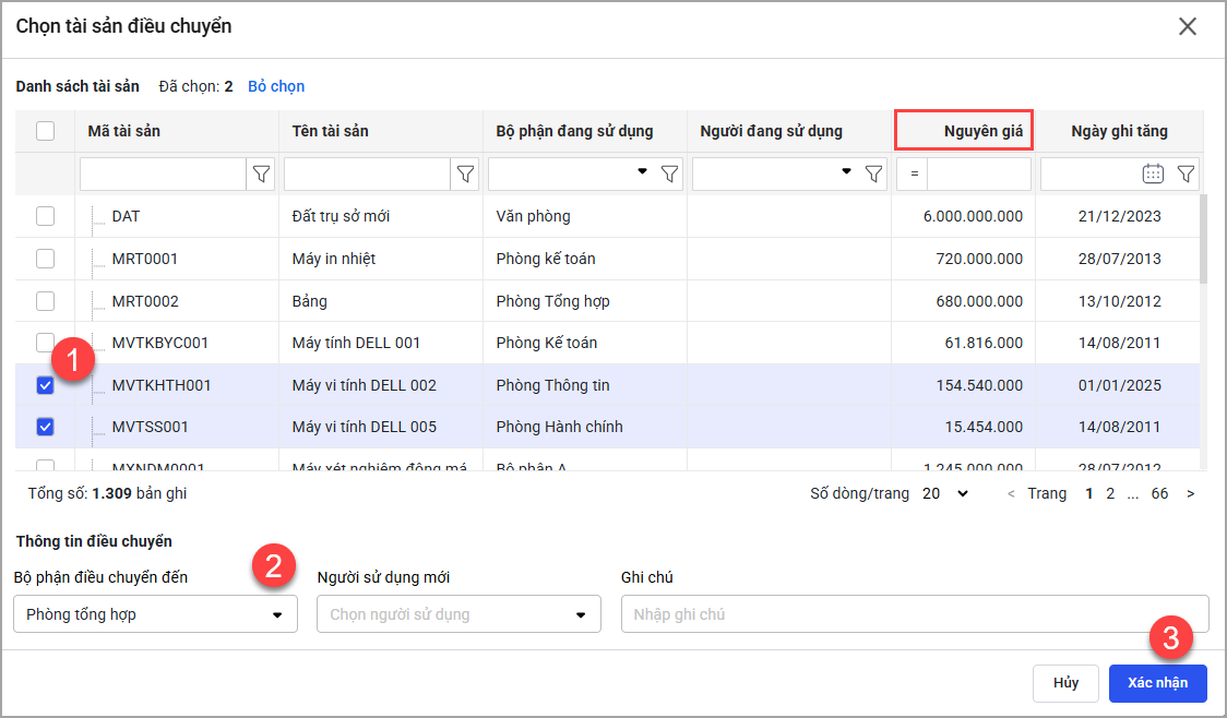 Bước 2: Chọn tài sản điều chuyển.