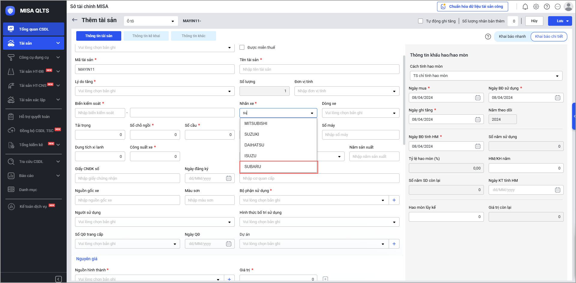Khi thêm tài sản là Ô tô, cán bộ QLTS có thể khai báo nhãn xe Subaru