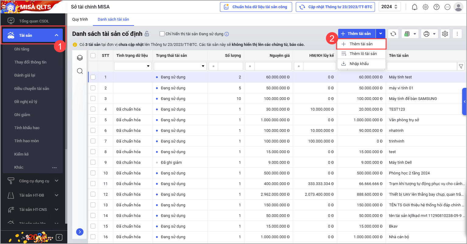 Bước 1: Vào menu Tài sản\Thêm tài sản