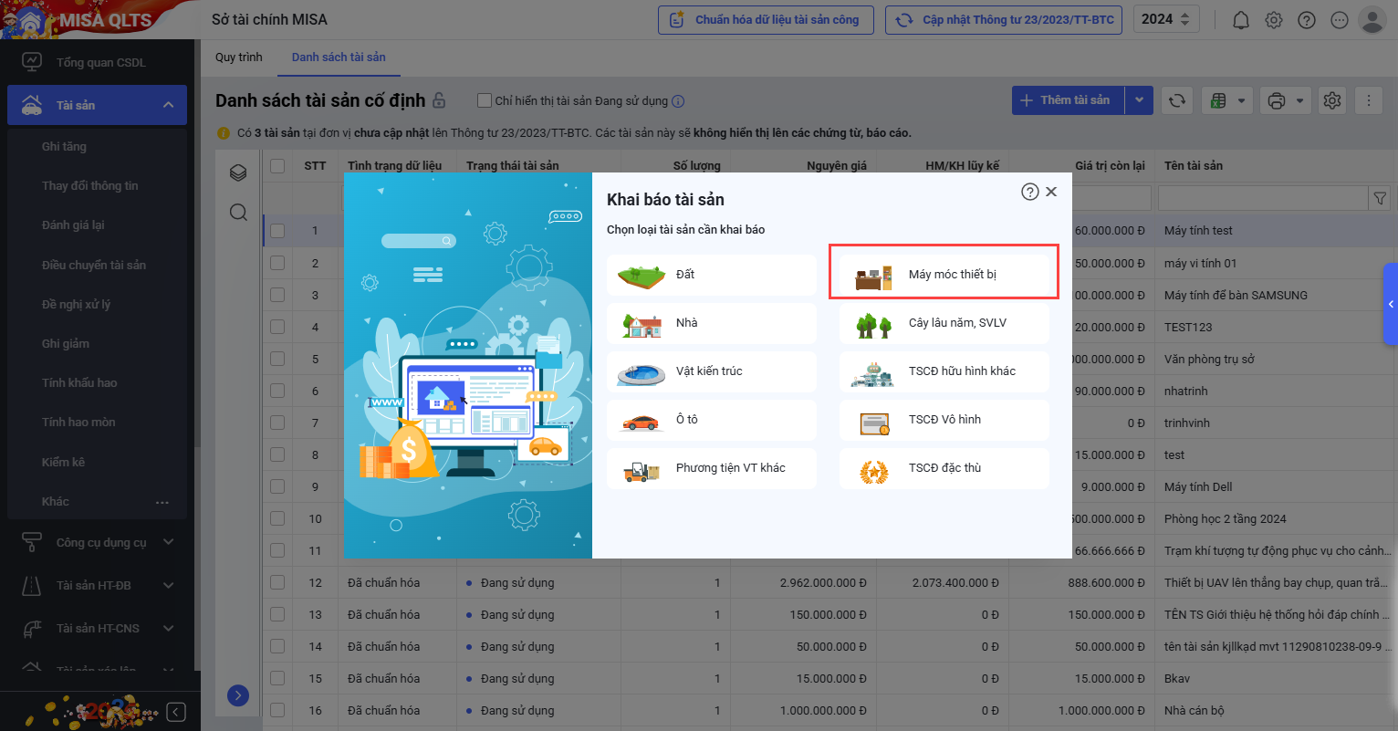 Bước 2: Chọn tài sản muốn khai báo. Ví dụ, nếu anh/chị khai báo một máy tính để bàn, chọn Loại tài sảnMáy móc thiết bị.