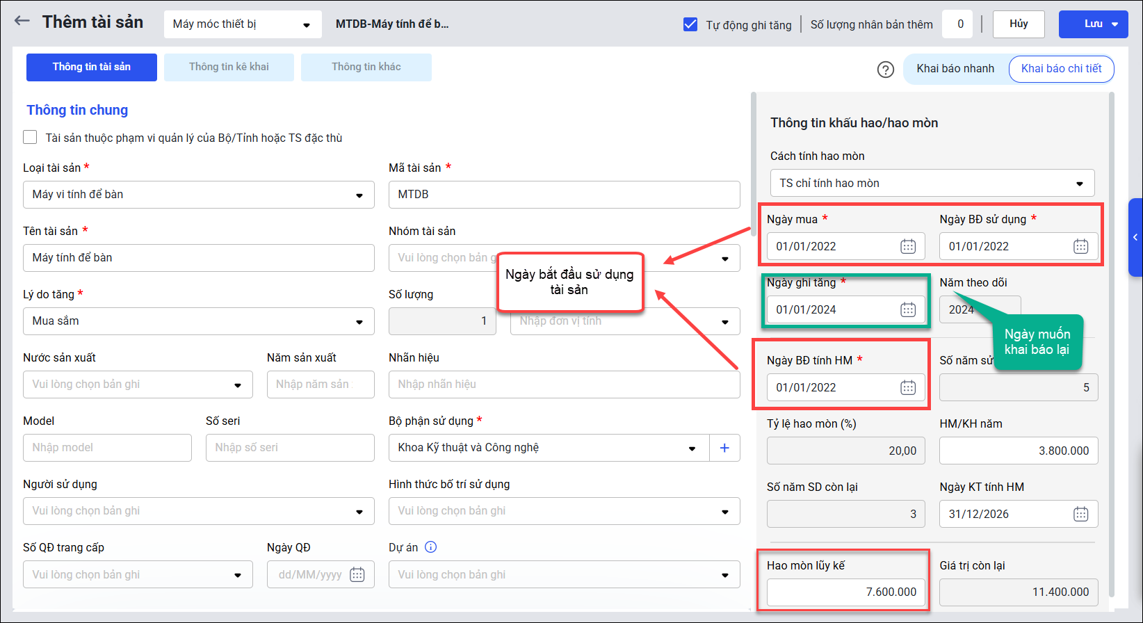 • Ngày mua, Ngày BĐ sử dụng, Ngày BĐ tính HM: Ngày bắt đầu đưa vào sử dụng (Ngày 01/01/2022).