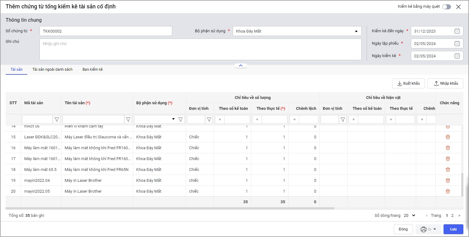 • Nhập thông tin chứng từ tổng kiểm kê tài sản: